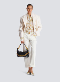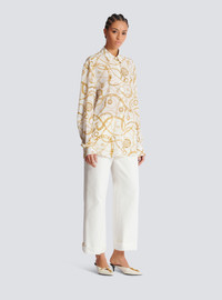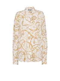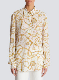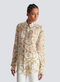 Printed silk shirt with all-over Balmain Chains pattern - Shirt collar - Long sleeves - Straight cuffs with 2 buttons - Metal “Gold and Gold Coin” buttons - PB and Balmain Paris logos worked into the pattern - Under-placket fastening with 6 engraved buttons - Rounded hem - Straight flowing cut - Model measures 179cm and wears a size 36 - Main material: 100% silk - Made in Poland - Item: FF1HS435SF00