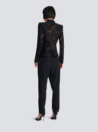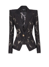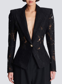 1-button lace jacket - Italian tailored collar - Structured shoulders - Long sleeves - Trompe-l'oeil breast pocket - Fastening with 1 "Chain Coin" button in gold and silver metal - 2 trompe-l'œil side pockets - Tulle lining - Bias trim - Tailored fit, defined waist - Model measures 178cm and wears a size 36 - Main material: 87% cotton 13% polyamide - Made in France - Item: FF1SG230CG08