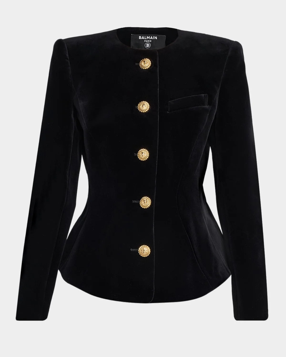 Balmain collarless jacket is crafted from velvet featuring signature goldtone buttons and strong structured shoulders Round neckline; singlebreasted front Long sleeves; button cuffs Padded shoulders Chest welt pocket Slim fit Hip length Cotton Made in Italy