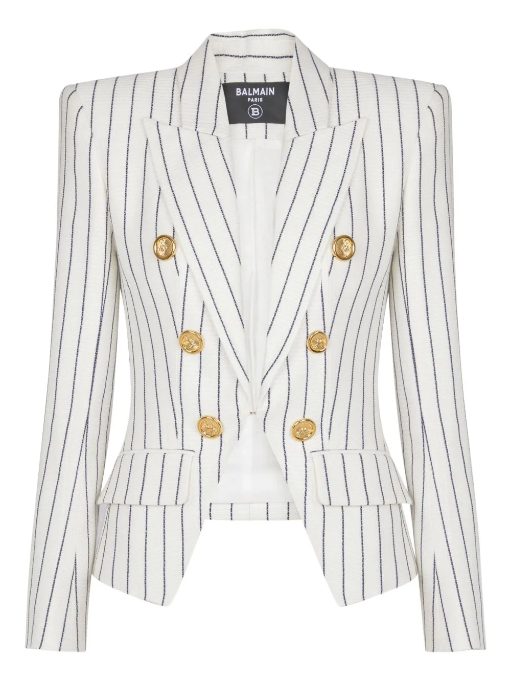 six-button pinstripe blazer Highlights - White - Pinstripe pattern - Six-button fastening - Peak lapels - Front flap pockets - Buttoned cuffs Imported Composition Viscose 95%, Linen/Flax 5% Washing instructions Read Manufacturer Guidelines