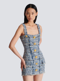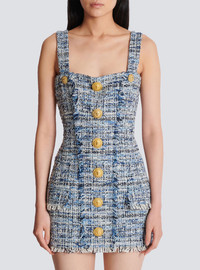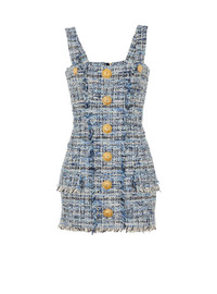 Tweed dress with straps - Square neckline - 8 decorative "Double Chain Lion" buttons in gold metal on the front - 2 side pockets with flaps - Visible gold metal zip fastening on the back with Balmain Paris-engraved slider - Raw hems - Twill lining - Short slim fit - Model measures 179cm and wears a size 36 - Main material: 78% cotton 10% acrylic 8% viscose 3% polyamide 1% polyester - Made in Poland - Item: EF1R2380CF77