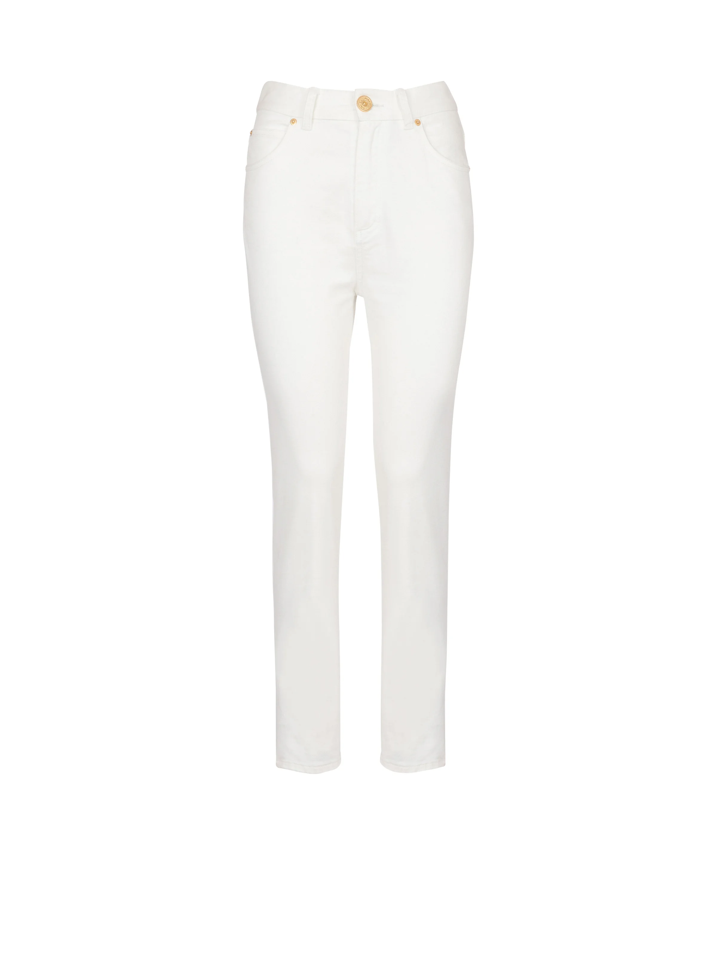 Slim fit jeans - High waist - Four pockets - Concealed zip fastening and gold embossed button - Belt loops - Tight fit - True to size (select your usual size) - The model is wearing a size FR 36 - The model’s height is 178 cm - Main material: 98 % cotton, 2% elastane - Made in Italy - Item: EF1MG009DB69