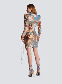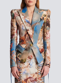 Slim-fit Sky printed canvas jacket - Hourglass "Jolie Madame" cut - Tailored collar with wide pointed lapels - Structured shoulders - Button fastening, 1 signature gold "lion's head" engraved button - Long sleeves, lace-up slit at the bottom of the sleeves to the elbows - Side pockets with flaps - Satin lining - Model measures 175cm and wears a size 36 - Materials: 100% linen - Made in Slovakia - Item: AF0SE008HB18 This Balmain item is made from linen fibre. Linen cultivation and the weaving process are environmentally friendly. This very hardy plant requires limited irrigation, little fertiliser and few pesticides, all the while absorbing CO2 from the air.