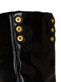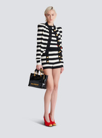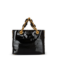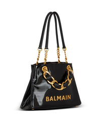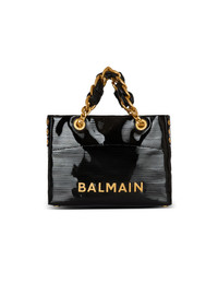 Small 1945 Soft tote bag in striped patent leather - Carry in the hand or wear on the shoulder - Metal Balmain logo - Adjustable side gussets, 3 press studs - Double handles in leather and chains interlaced with leather - Engraved eyelets - Magnetic fastening - Twill lining - Inside pocket with press stud - Embossed leather card pocket - Reinforced bottom - Metal bag feet - Gold hardware - Dimensions: 35 x 22 x 7.5 cm - Main material: 100% calfskin - Made in Italy - Item: EN0FD871LSTV