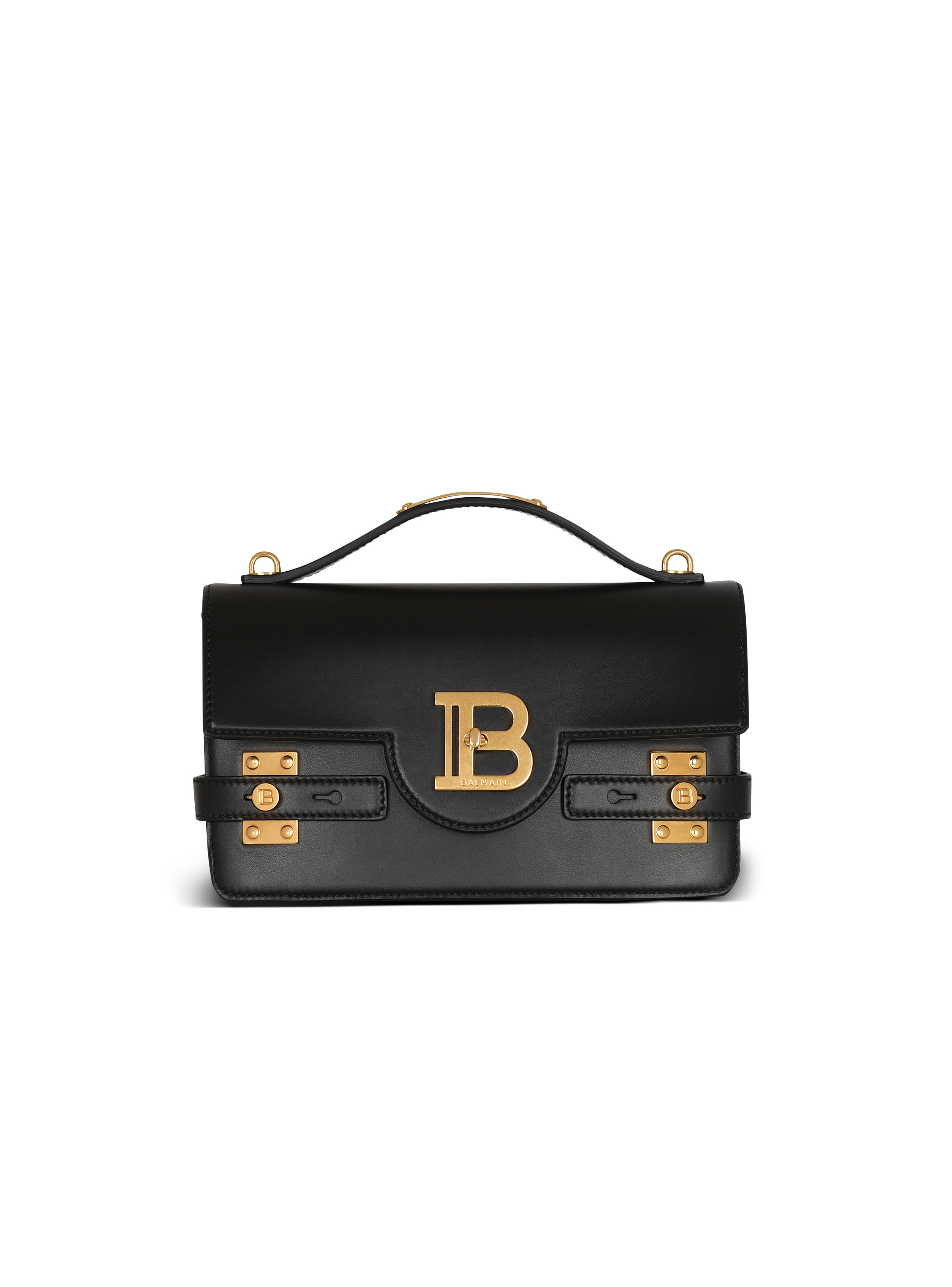 Smooth leather B-Buzz 24 bag - Thin removable leather shoulder strap and handle - Flap closure with B-Twist clasp - Engraved golden metal Balmain B logo on the front - Engraved golden metal Balmain plaque on the handle - 2 compartments, 1 card holder and a patch pocket on the inside - Golden hardware - Smooth leather lining - Dimensions: 23 x 14 x 8 cm - Main material: 100% calfskin leather - Made in Italy - Item: CN1DA828LAVE
