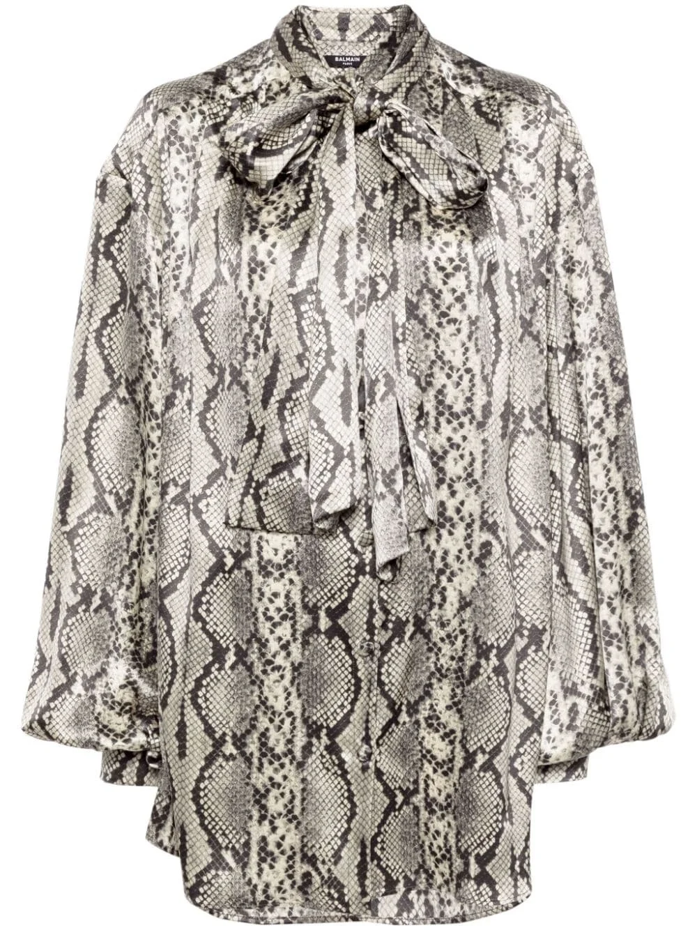 snakeskin-print silk blouse Highlights - Medium grey - Silk - All-over snakeskin print - Fabric-covered buttons - Bow detailing - Gathered neckline - Front button fastening - Drop shoulder - Long sleeves - Fitted-cuff sleeves - Curved hem Imported Composition Silk 100% SIZE & FIT Model measurements Height 5 ft 10 in(1.78 m) Bust/Chest 32.67 in(83 cm) Hips 37 in(94 cm) Waist 25.59 in(65 cm) FittingInformation Designed to be unstructured, offering a loose fit throughout Made from a midweight non-stretch fabric This piece fits true to size – take your usual size