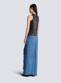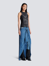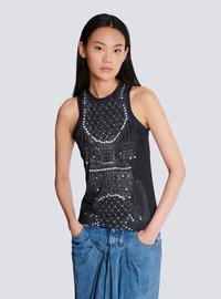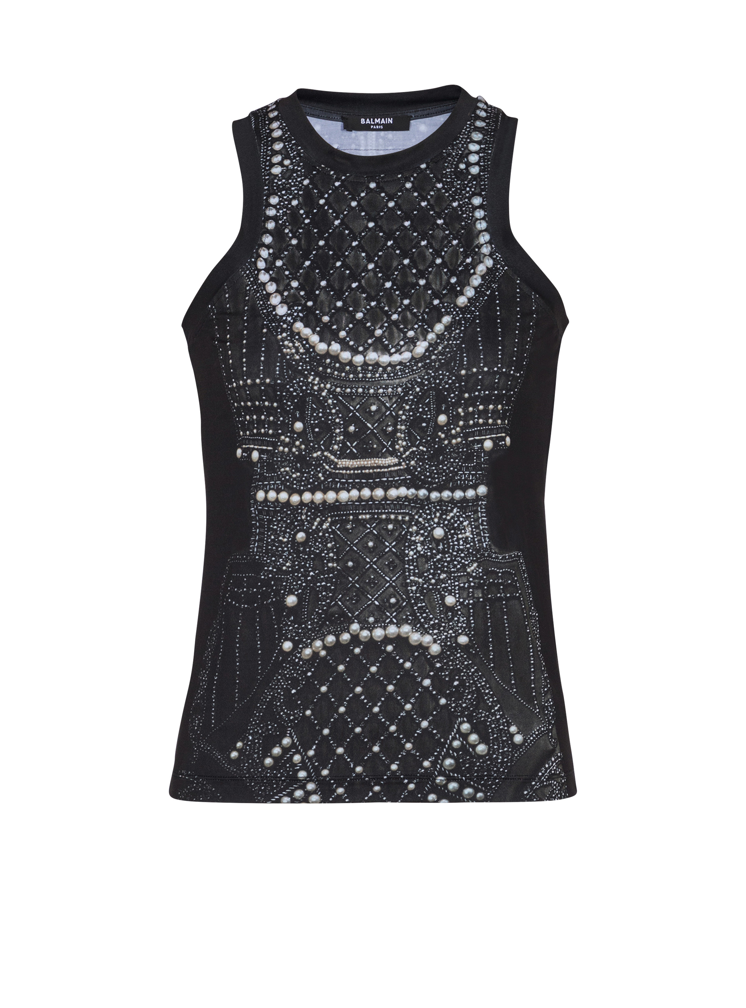 Satin jersey tank top with faux embroidery print - Round neckline - Contrasting optical illusion printed on the front and back - Woven Balmain Couture label on the back - Ribbed neckline and armholes - Relaxed slim fit - Model measures 179cm and wears a size S - Main material: 84% polyester 16% elastane - Made in Bulgaria - Item: EF1EB045GE48