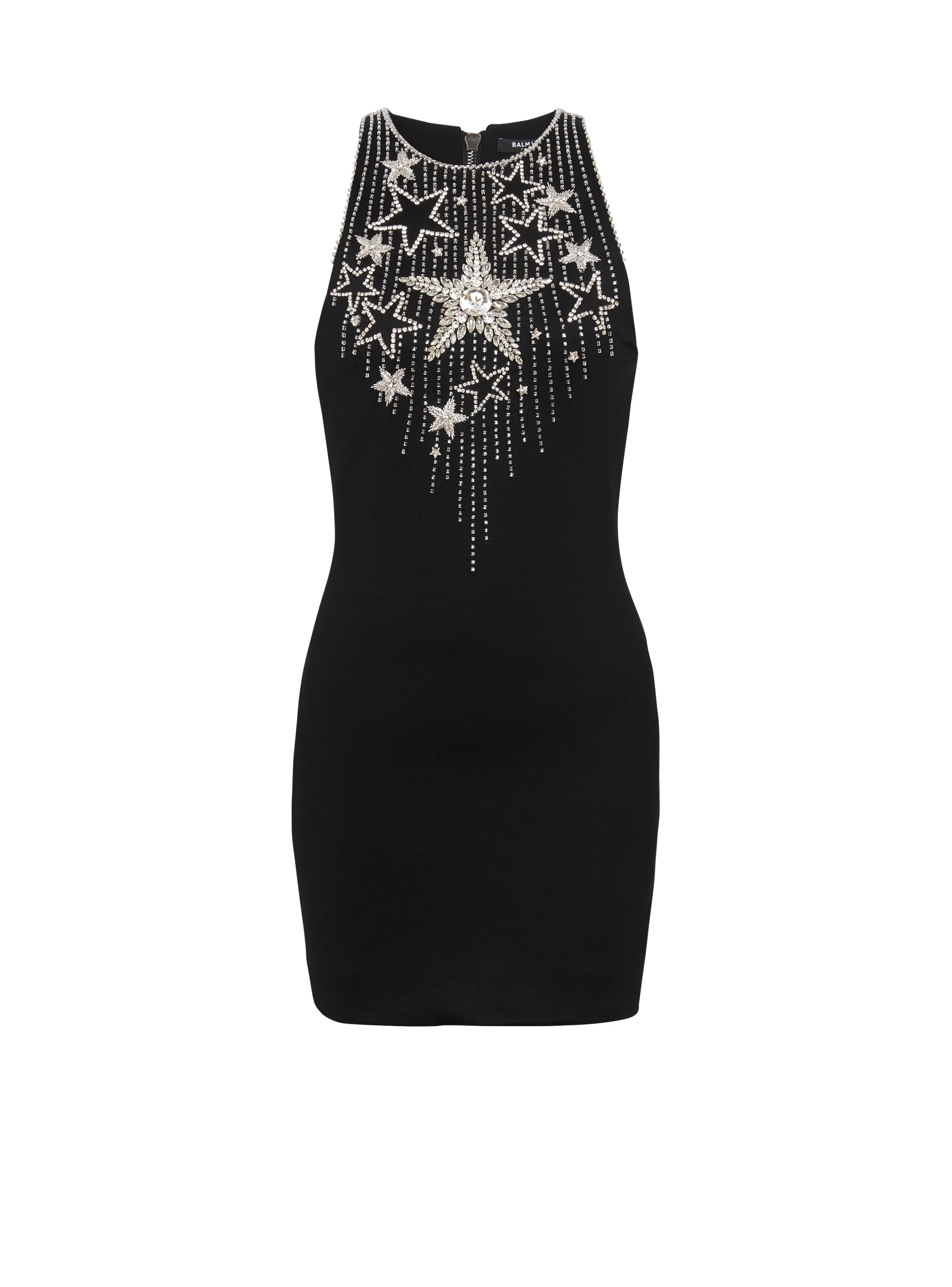 Short dress embellished with shooting stars - Star pattern bib front embroidered with crystals, glass beads and silver micro-sequins - Long, tight fit - Round neck - Sleeveless - Fastening with black metal zip at the back - Model measures 180cm and wears a size 36 - Main material: 90% Viscose 9% Polyamide 1% Elastane - Made in France - Item: CF1R4001PC18100% of this item’s ENKA® viscose fibres are sourced from FSC®-certified sustainably-managed forests