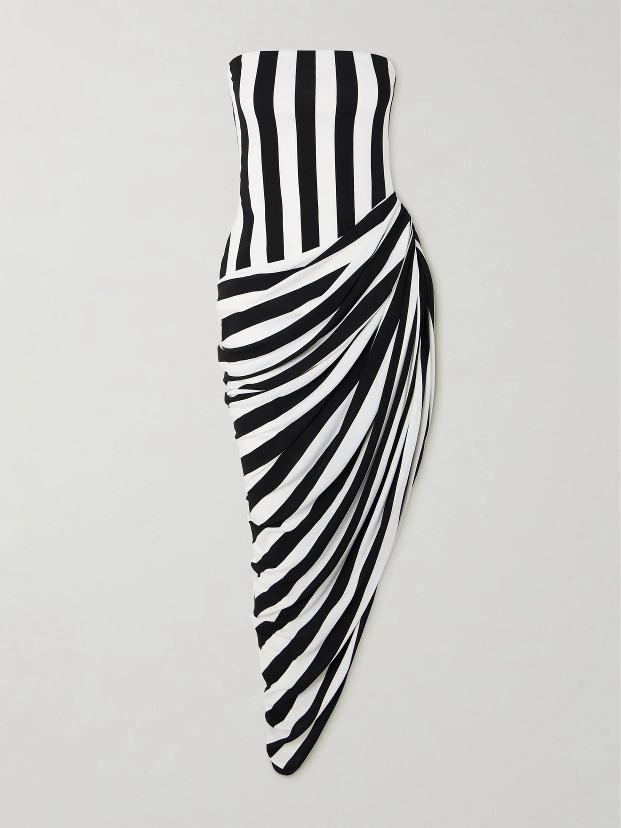 Balmain's dress embodies an '80s maximalist feel. It's cut from jersey with a strapless neckline and falls to a draped asymmetric skirt reminiscent of a pareo.