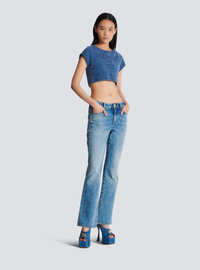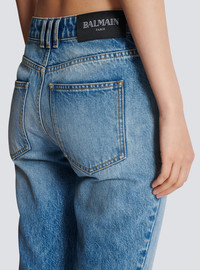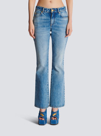 Flared denim jeans - Waistband with belt loops and a triple belt loop at the back - Woven vintage Balmain label - Zip fastening with a metal "Double Chain Lion" button - 5 classic pockets - Engraved metal rivets - Gold hardware - Medium blue wash - Model measures 179cm and wears a size 36 - Main material: 100% cotton - Made in Romania - Item: EF1MJ130DF24