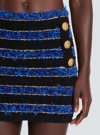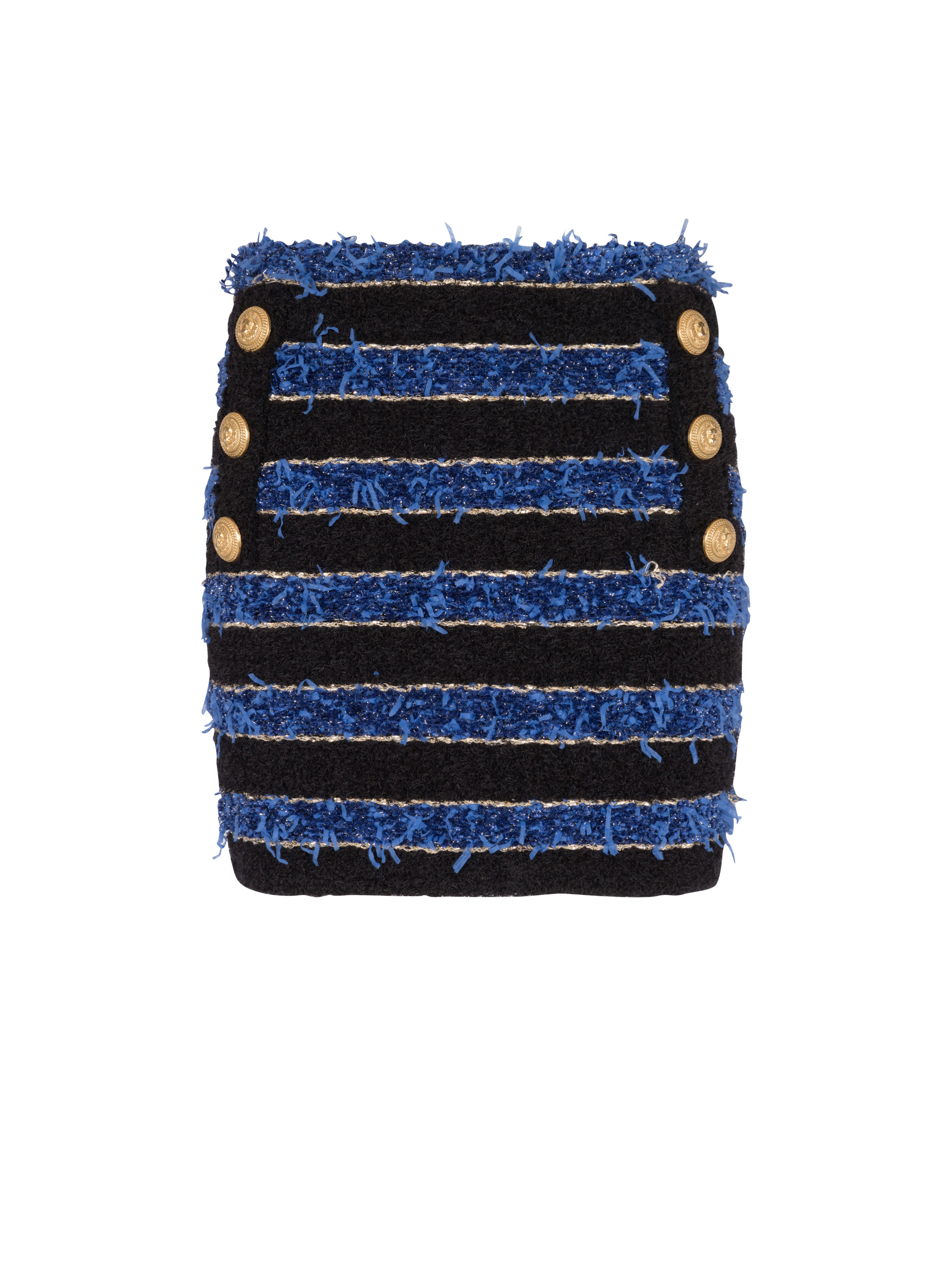 Short striped tweed skirt - Fancy metallic striped tweed - trompe-l’oeil fall-front buttoned fastening - 6 gold “lion head” embossed buttons - back zip fastening - visible gold-coloured XL zip - Tight fit - This item fits true to size (select your usual size) - The model is wearing a size S - The model's height is 177 cm - Materials: 44% acetate, 25% polyamide, 23% viscose, 7% polyester, 1% cotton - Made in France - Item: AF1LB190KE04