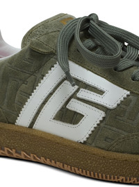 Suede Balmain Swan trainers - Multi-material design in calfskin and suede embossed with the PB Labyrinth monogram - Lace fastening - Diamond-embossed leather tongue with gold PB logo - Contrasting PB logo on the side - Embossed gold Balmain logo on the side - Contrasting panel with embossed Balmain Paris logo on the back - Textured rubber outsole with raised Balmain logo - Leather lining - Leather insole - Main material: 100% calfskin leather - Made in Portugal - Item: DN0VI735LCCM