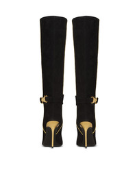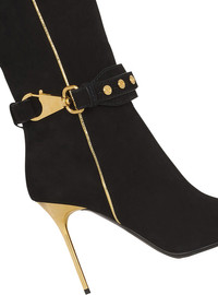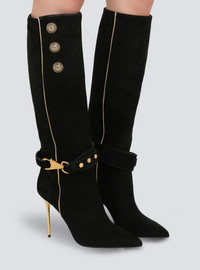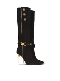 Suede Robin boots 9.5 cm / 3.7 in heel in a burnished gold metal finish, removable strap with Balmain monogram buckle in a gold finish and decorative buttons, three signature buttons on side, leather sole, pointed toe Fits true to size: select your usual size. Made in Italy Material: Calfskin Item: XN1TA567LCML