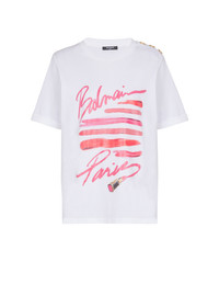 T-shirt with Balmain Lipstick print - Round neck with ribbed trim - 3 decorative embossed gold metal buttons on the shoulder - Short cuffed sleeves - Regular fit - Model measures 178cm and wears a size S - Main material: 100% cotton - Made in Portugal - Item: EF0EF135GE91100% of the cotton fibres used to make this garment are certified and organically farmed