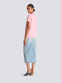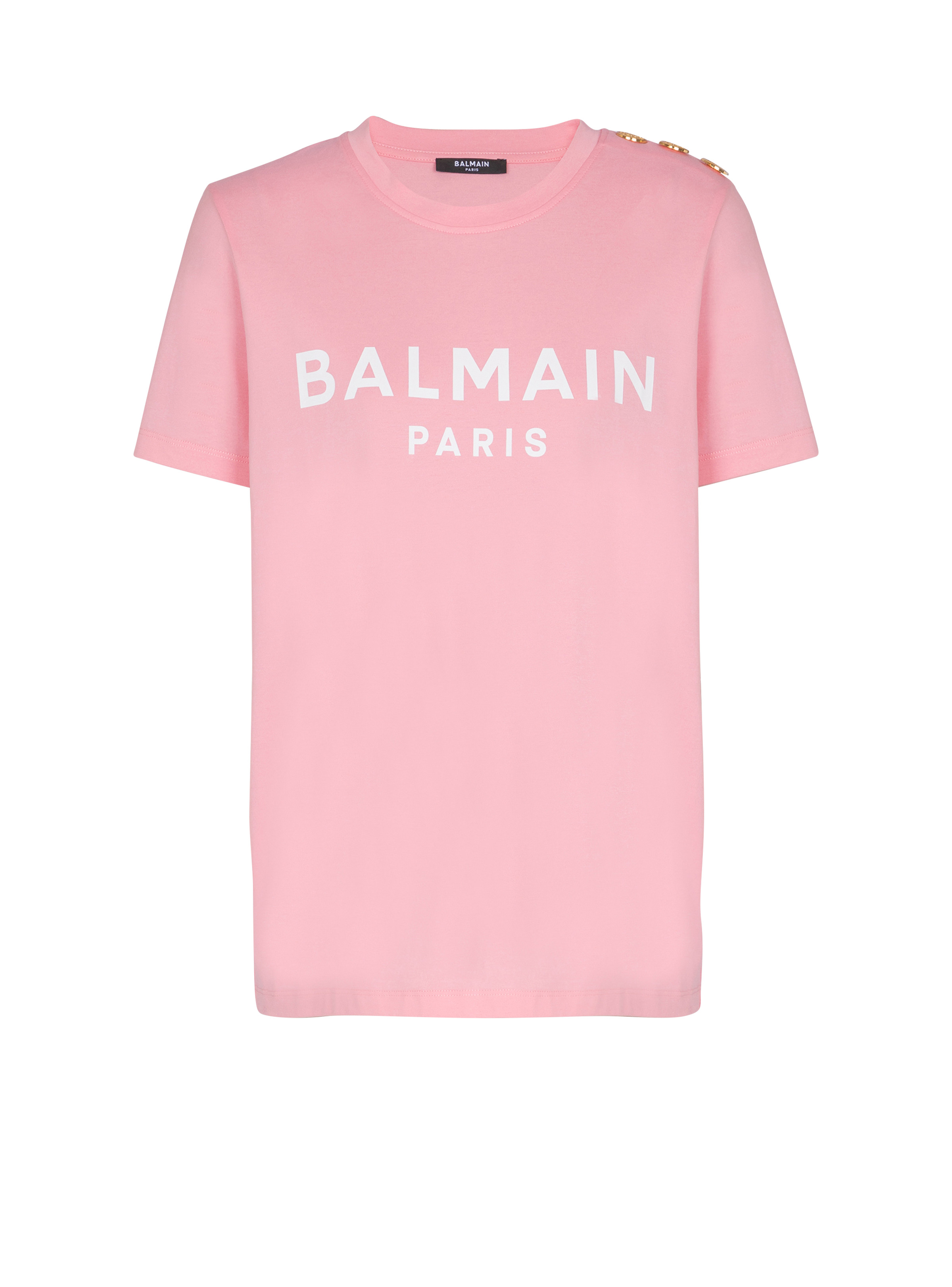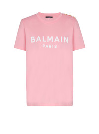 T-shirt with Balmain Paris print - Relaxed fit - Round neck with ribbed trim - 3 decorative embossed gold metal buttons on the shoulder - Short sleeves - Contrasting Balmain Paris logo printed on the front - Model measures 179cm and wears a size S - Main material: 100% cotton - Made in Portugal - Item: BF1EF005BB02100% of the cotton fibres used to make this garment are certified and organically farmed