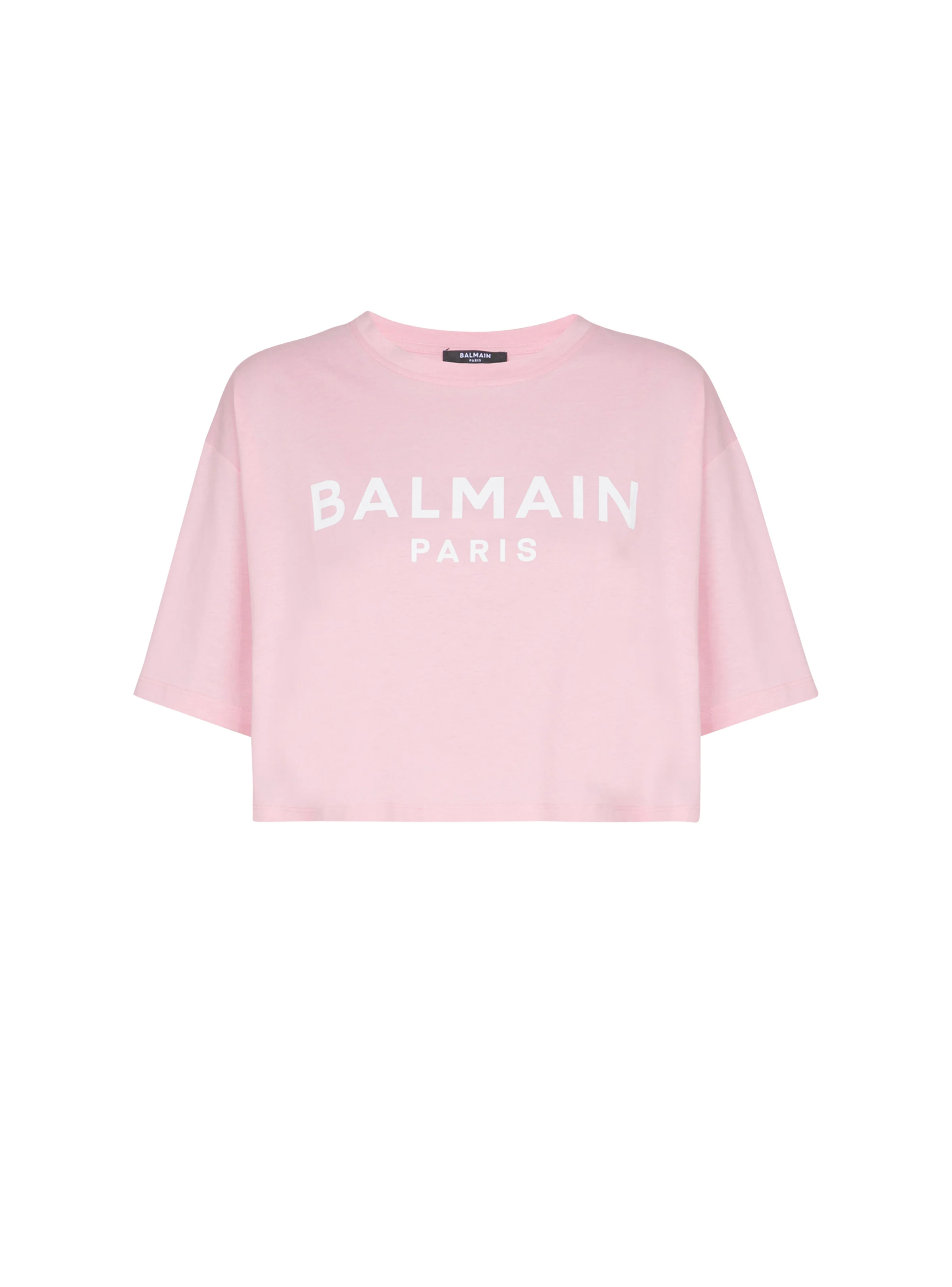 T-shirt with Balmain Paris print - Cropped, relaxed fit - Round neck with ribbed trim - Short sleeves - Contrasting Balmain Paris logo printed on the front - Model measures 180cm and wears a size S - Main material: 100% cotton - Made in Portugal - Item: BF1EE020BB02100% of the cotton fibres used to make this garment are certified and organically farmed