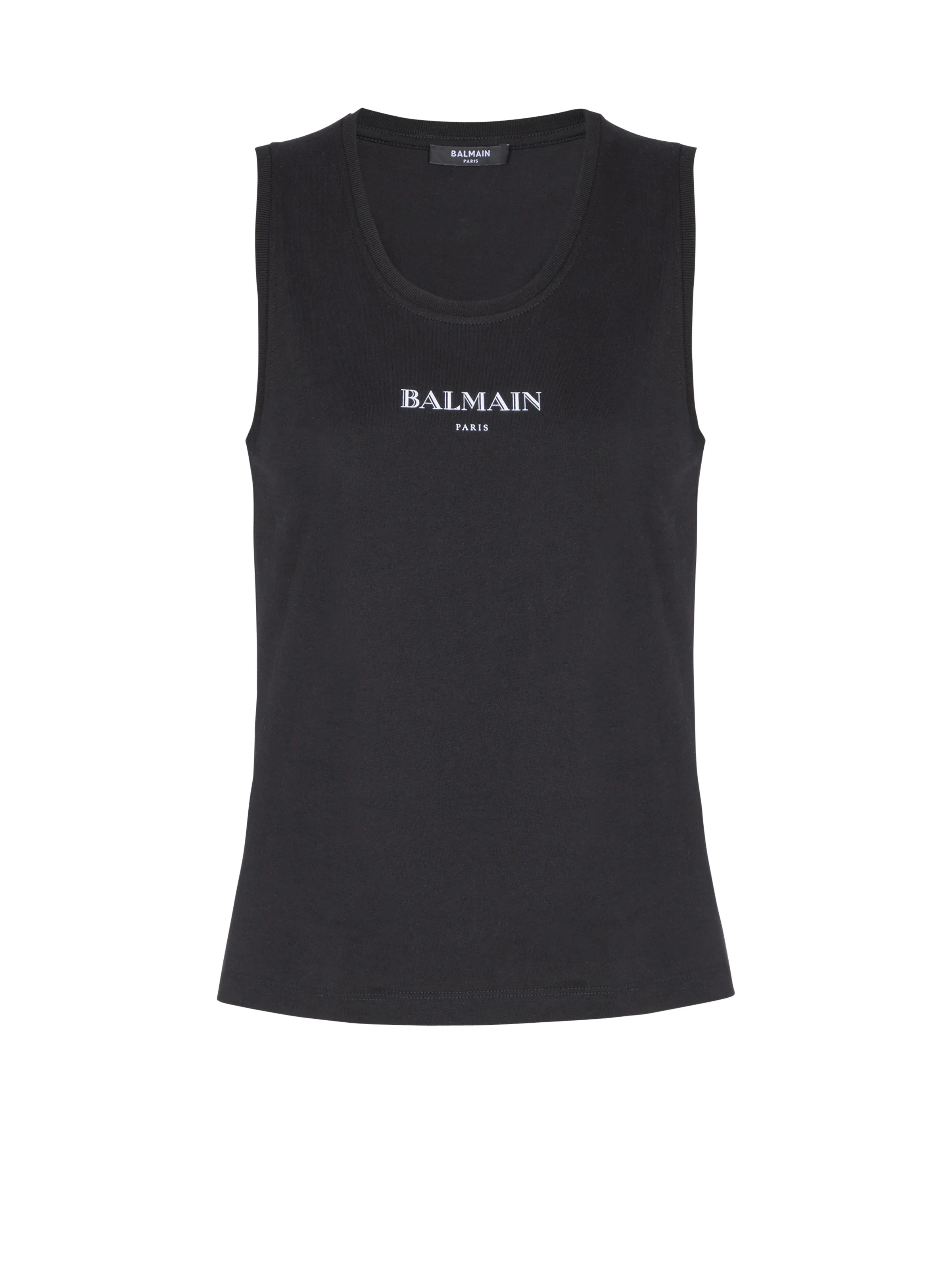 Tank top with Balmain print - Round neckline - Balmain logo printed on the front - Rounded hem - Relaxed fit - Model measures 178cm and wears a size S - Main material: 100% cotton - Made in Portugal - Item: FF2EB075BD36