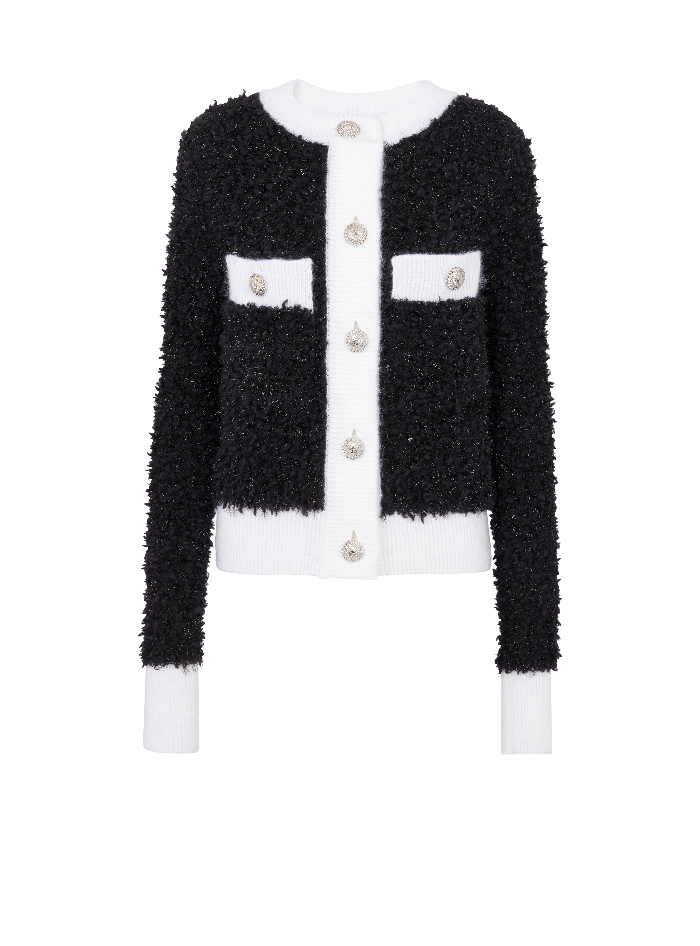 Textured knit and lurex cardigan - Round neck - Long sleeves - Signature Lion-button fastening in silver metal - 2 chest pockets with signature Lion buttons - Contrasting ribbed knit edges - Model measures 178cm and wears a size 36 - Material: 36% mohair, 33% polyamide, 31% wool - Made in France - Item: BF0KL125KF19