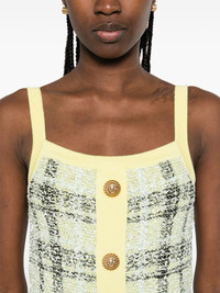 buttoned mini dress Highlights - Pale yellow - Check pattern - Round buttons - Sleeveless Made in Italy Composition Viscose 53%, Polyamide 27%, Polyester 14%, Cotton 5%, Metallized Polyester 1% Washing instructions Dry Clean Only