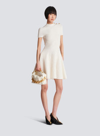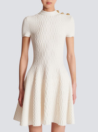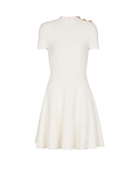 Flared crocodile-knit dress - Rounded crew neckline - 3 "Lion Head" buttons on the shoulder - Short sleeves - Ribbed edging - Fitted bodice - Model measures 178cm and wears a size 36 - Main material: 85% viscose 15% polyester - Made in Italy - Item: FF0R7151KJ03100% of the viscose fibres used to make this garment come from certified, sustainably managed forests
