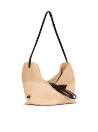 Track calfskin leather and raffia tote bag - Carry in the hand, on the shoulder or across the body - Leather handles - Textured Balmain Paris logo on the front - Versatile shoulder strap to adjust using the stud button - Side loops - Inside patch pocket - Embossed leather inside card pocket - Canvas lining - Dimensions: 16 x 36 x 26 cm - Main material: 100% polyamide - Made in Italy - Item: FN1FI015TJHD
