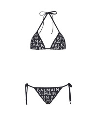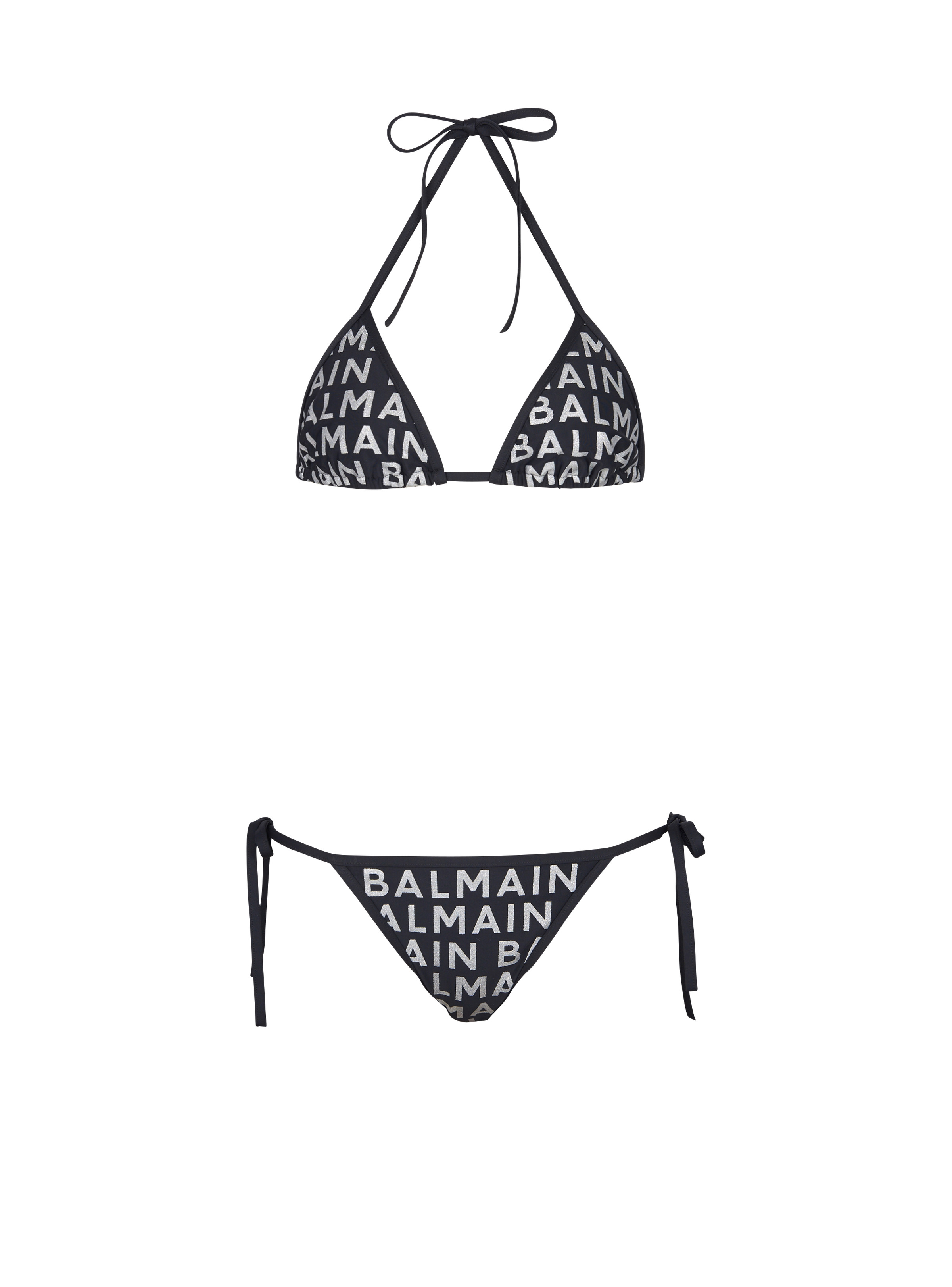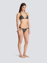 2-piece lycra swimsuit with metallic Balmain logo print - Triangle top with thin straps and drawstring - Low waist with side ties - Plain lining - Model measures 176 cm and wears a size 34 - Main material: 80% polyamide, 20% elastane - Made in Italy - Item: BKB90159