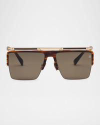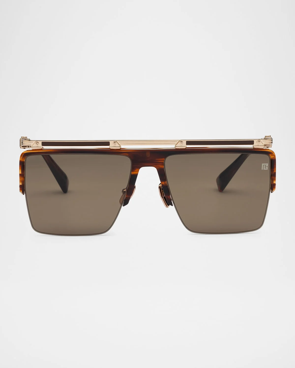 - Balmain "Triomphe" rectangle sunglasses in titanium and acetate - Eye/bridge/temple (in mm): 61-17-145 - Brow bar - Solid lenses - Saddle nose bridge - Thin, tapered arms - B monogram accents on lenses - Logo on earpieces - Titanium/acetate - 100% UVA/UVB protection - Made in Japan - Proposition 65 warning for California residents