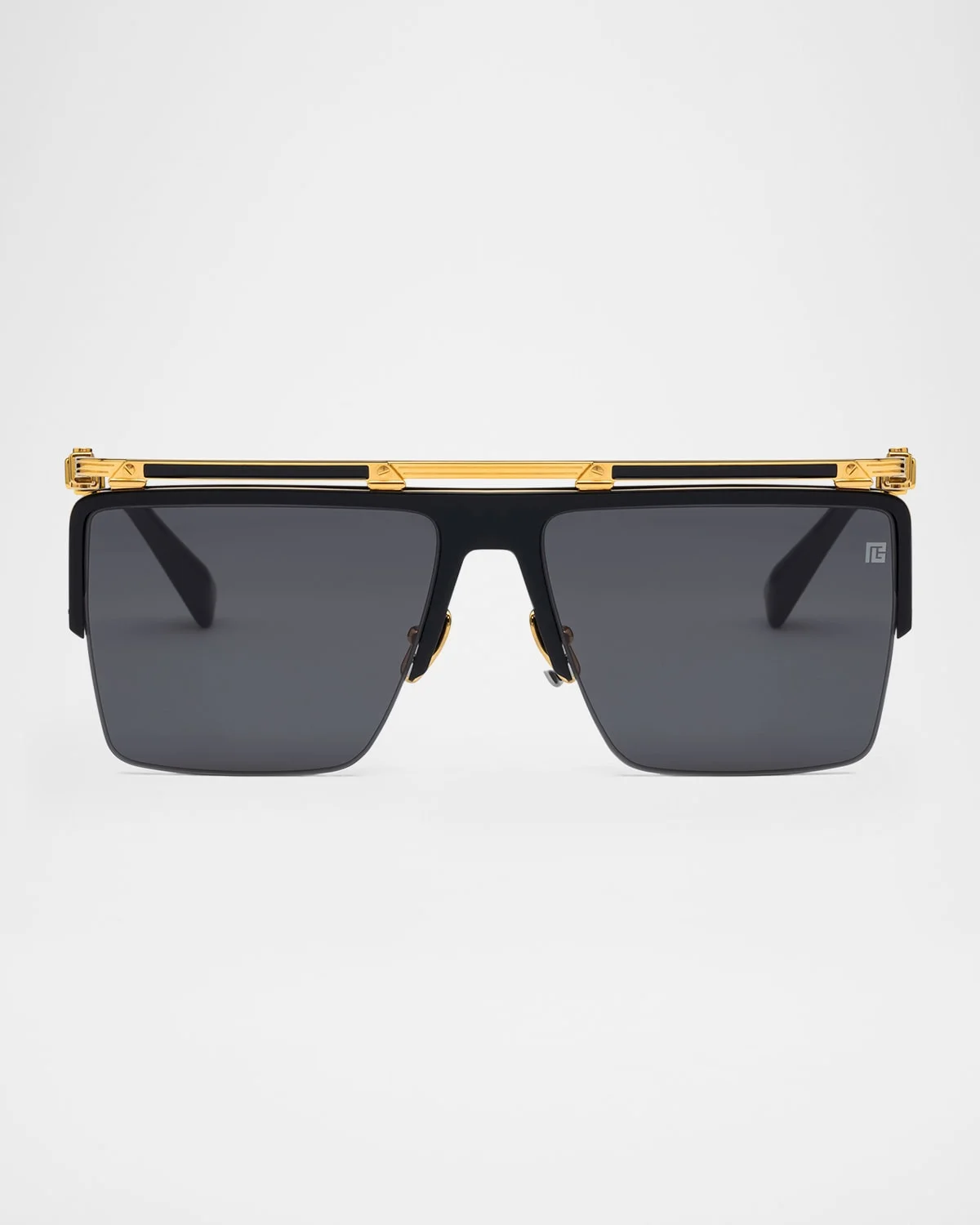 - Balmain "Triomphe" rectangle sunglasses in titanium and acetate - Eye/bridge/temple (in mm): 61-17-145 - Brow bar - Solid lenses - Saddle nose bridge - Thin, tapered arms - B monogram accents on lenses - Logo on earpieces - Titanium/acetate - 100% UVA/UVB protection - Made in Japan - Proposition 65 warning for California residents
