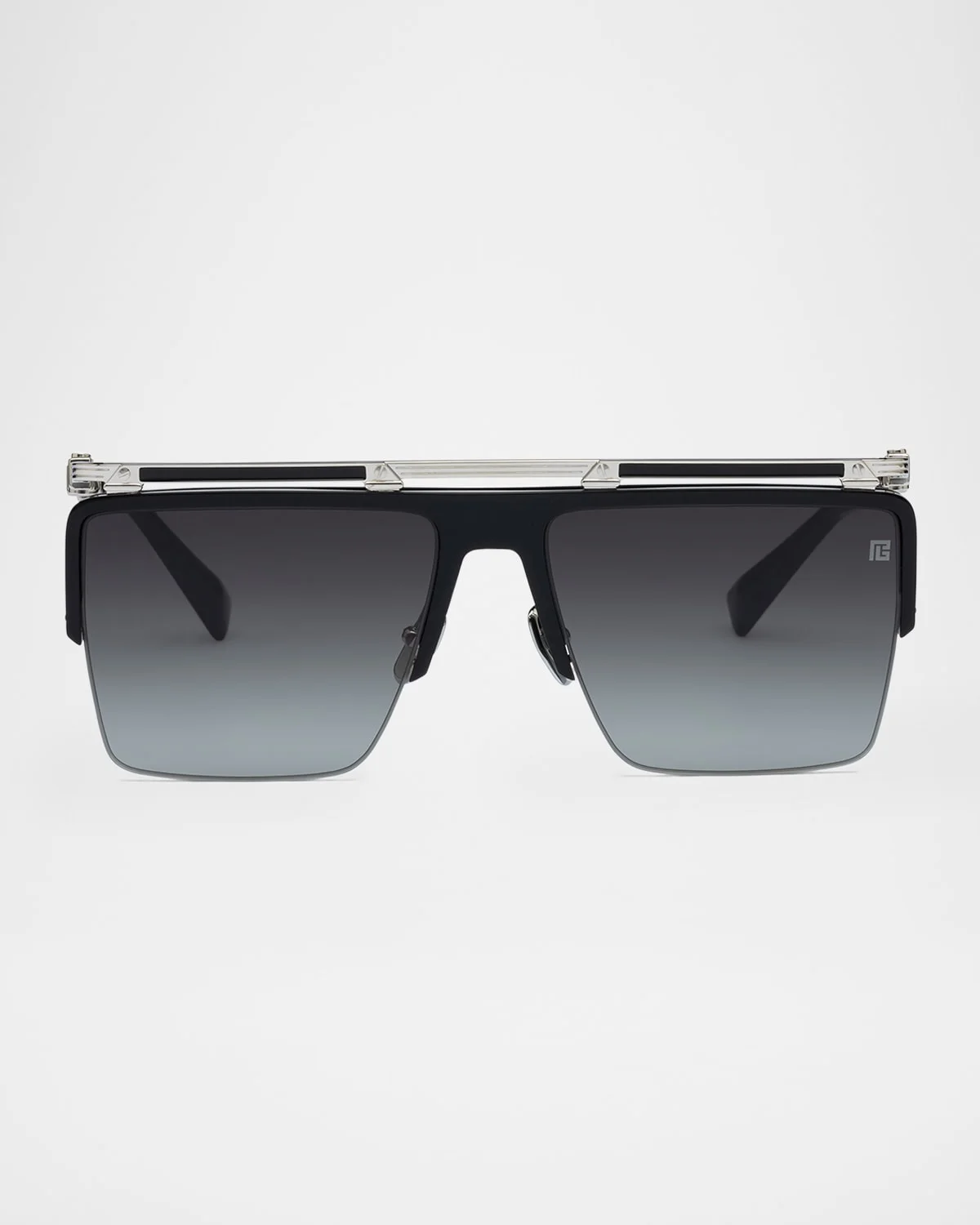 - Balmain "Triomphe" rectangle sunglasses in titanium and acetate - Eye/bridge/temple (in mm): 61-17-145 - Brow bar - Solid lenses - Saddle nose bridge - Thin, tapered arms - B monogram accents on lenses - Logo on earpieces - Titanium/acetate - 100% UVA/UVB protection - Made in Japan - Proposition 65 warning for California residents