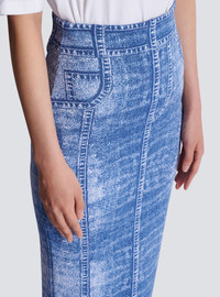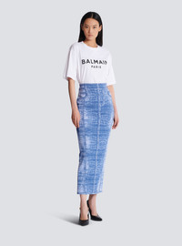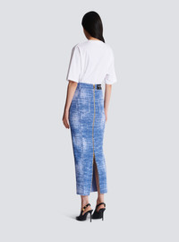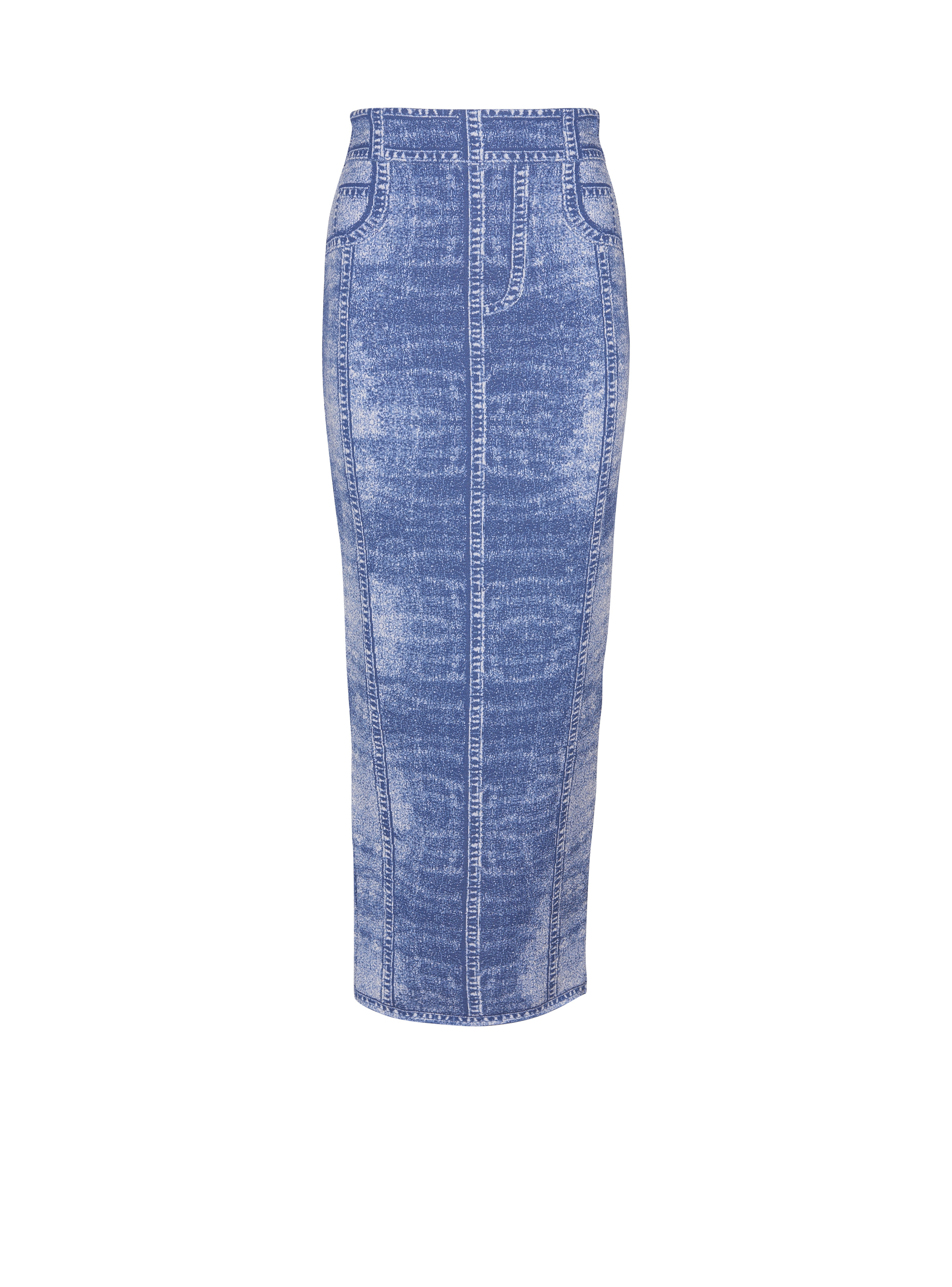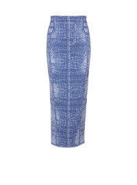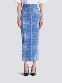 Jacquard knit skirt with denim effect - Reinforced waistband - Visible gold metal double zip fastening on the back with Balmain Paris-engraved sliders - Woven Balmain Couture label on the waist - Midi, tight, high-waisted fit - Model measures 179cm and wears a size 36 - Main material: 84% viscose 8% polyamide 8% polyester - Made in France - Item: EF1LD475KH80100% of the viscose fibres used to make this garment come from certified, sustainably managed forests
