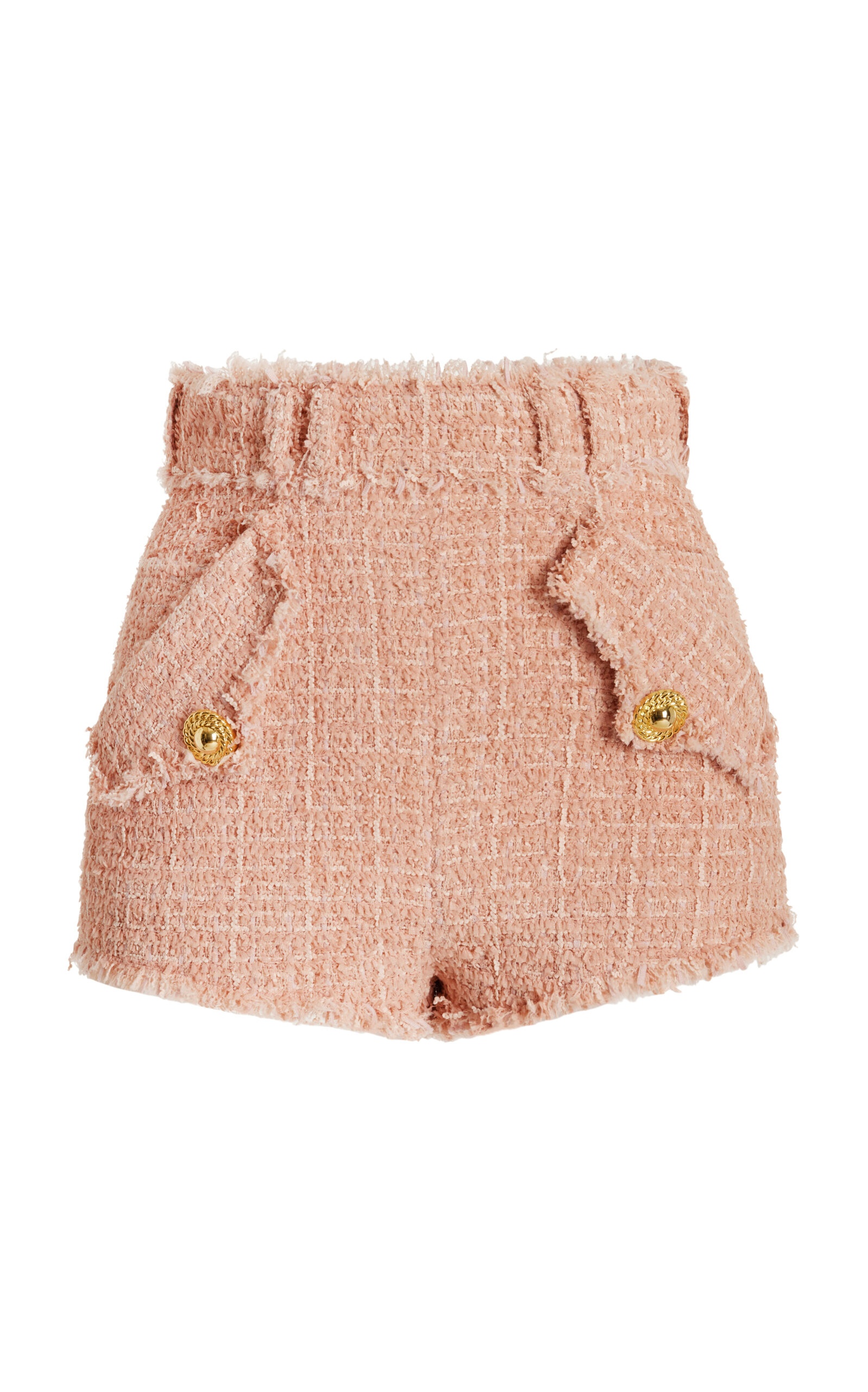 Inspired by the label’s modern muse, Beyoncé, the Resort ‘24 collection seamlessly blends Balmain’s signature “Jolie Madame” glamor with American Western flair. These cheeky mini short are tailored from fringed tweed decorated with signature gold shank buttons. PRODUCT DETAILS - Resort '24 - Zip fastening along back - Composition: 79% polyamide, 15% virgin wool, 6% cotton - Dry clean - Imported SIZE & FIT - Our model is 175cm/ 5'9" and wearing a size FR 36 - Designed for a slim fit