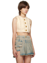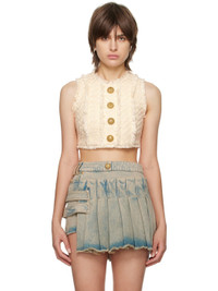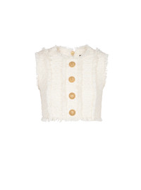 <p>Tweed crop top with buttons </p><ul><li>Sleeveless</li><li> gold embossed buttons </li><li> Tight fit </li><li> This item fits true to size (select your usual size) </li><li> The model is wearing a size S </li><li> The model's height is 177 cm </li><li> Material: 43% cotton, 27% organic cotton, 23% viscose, 5% acrylic, 1% polyester, 1% metallic polyester </li><li>Made in France </li><li>Item: AF1AB245CD27</li></ul>
