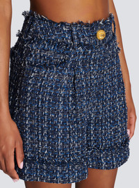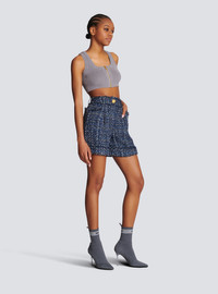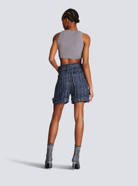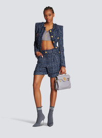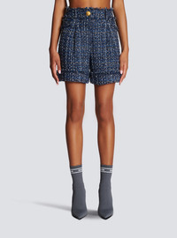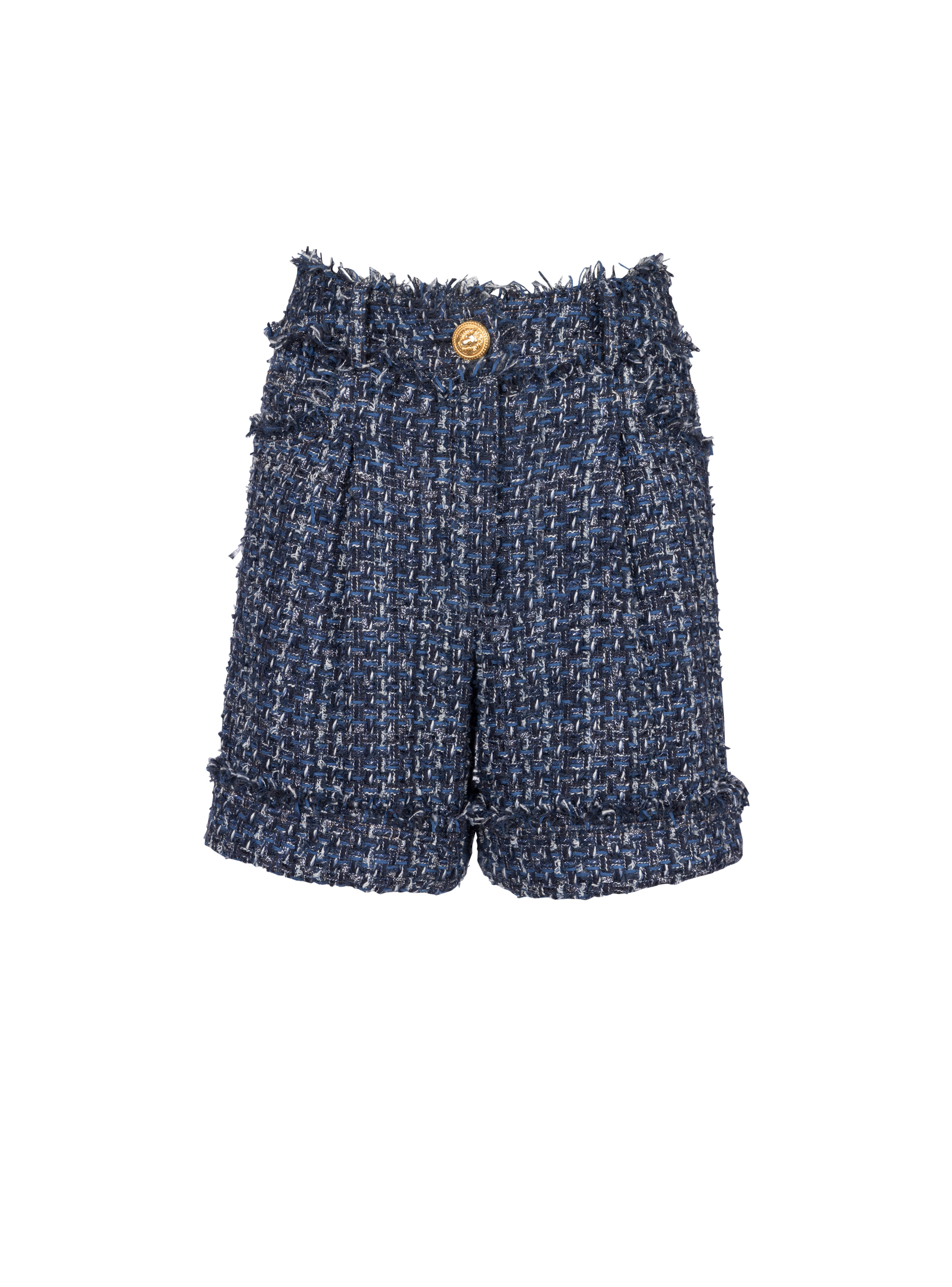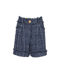 Tweed high-waisted shorts Four pockets, belt loops, gold embossed button Tight fit This item fits true to size (select your usual size) The model is wearing a size S The model's height is 177 cm/5 ft 9 in, bust 81 cm/32 in, waist 58 cm/23 in and hips 89 cm/35 in Made in Poland Material: 31% cotton, 19% polyamide, 19% acetate, 15% viscose, 11% polyester, 5% linen Item: YF0PA127XD46