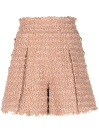 tweed high-waisted shorts from Balmain featuring beige, cotton blend, tweed, high-waisted, frayed detailing and rear zip fastening. Size & Fit Model Measurements: Height: 1.79 m Bust/Chest: 79.0 cm Hips: 89.0 cm Waist: 61.0 cm Model wears size 36 Fabric and Care Designer Style ID: AF1PA089XE36 Designer Colour: 0AM NUDE Composition: Outer: Polyamide 49%, Metallized polyester 1%, Cotton 50%, Viscose 100%; Lining: Cotton 48%, Viscose 52% Washing instructions: Dry Clean Only Made in Poland