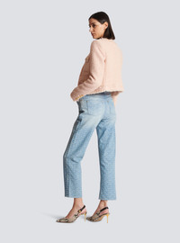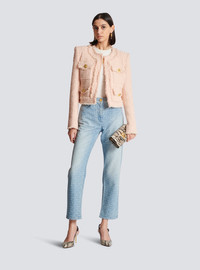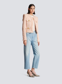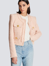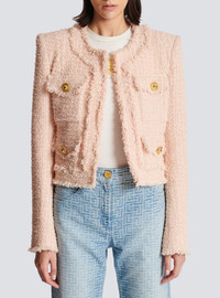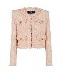 Collarless tweed jacket - Straight short cut - Round neck - Structured shoulders, long sleeves - Tailored cuffs, 5 golden metal buttons - Button fastening at the front, 4 “Signature Lion” golden metal buttons - 4 flap pockets - Frayed hem - Model measures 180cm and wears a size 36 - Main material: 79% polyamide 15% virgin wool 6% cotton - Made in Poland - Item: CF1SK595XF91