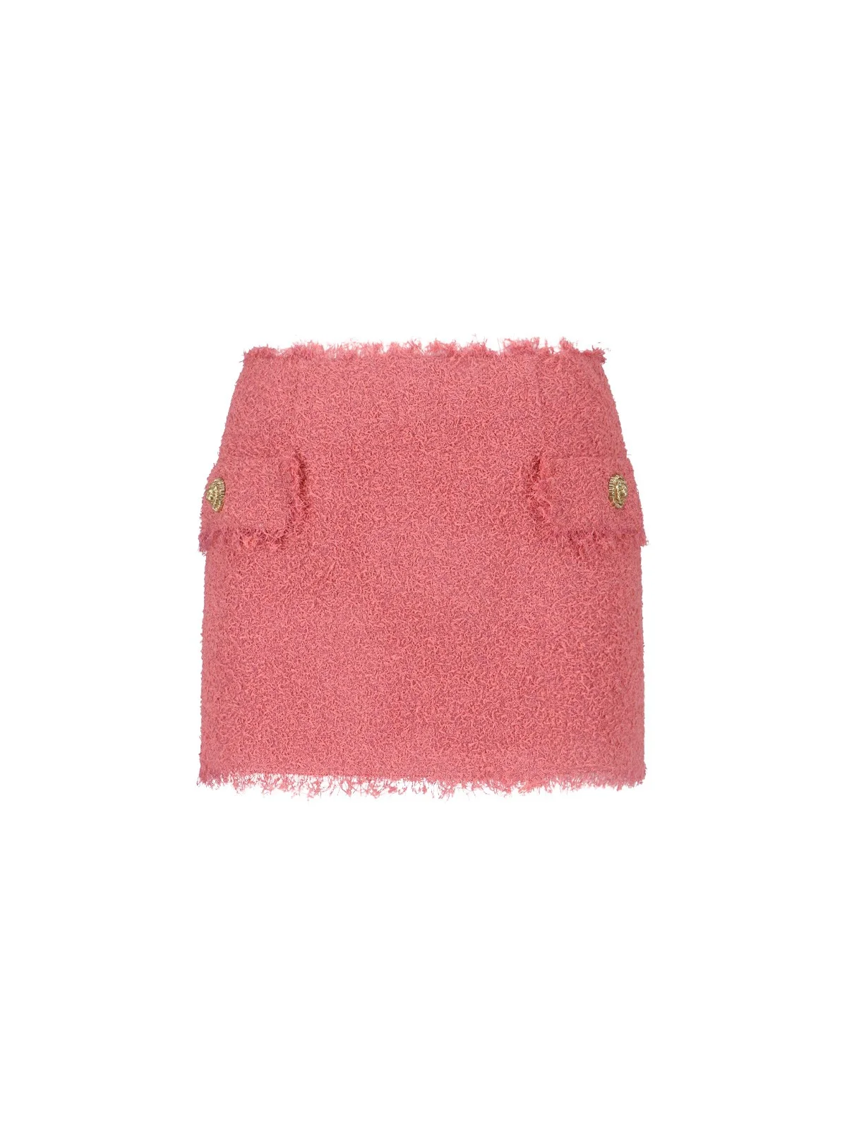 - TWEED MINI SKIRT BY BALMAIN IN PINK VIRGIN WOOL - LOW WAIST - BACK ZIP CLOSURE - TWO FRONT BUTTON POCKETS PRODUCT INFO PRODUCT CODE GF0LBB50WD604HO COMPOSITION: 81% VIRGIN WOOL, 19% POLYAMIDE SIZE AND FIT: REGULAR FIT MADE IN: POLAND