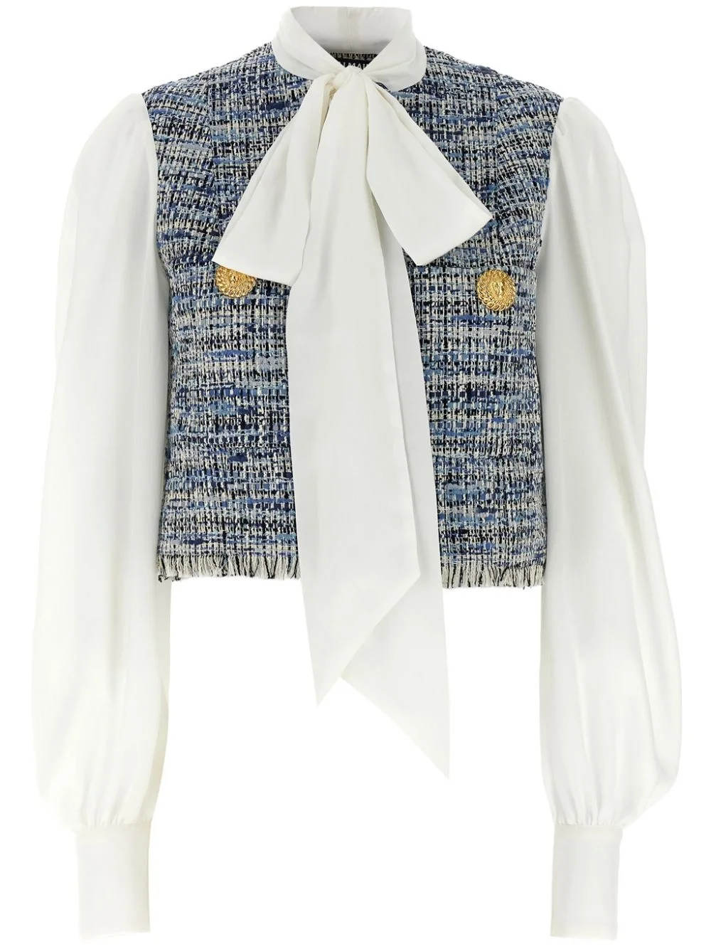 tweed-panel blouse Highlights - Blue - Pussy-bow collar - Long sleeves - Buttoned cuffs Made in France Composition Cotton 100%