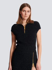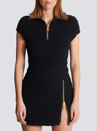 Tweed top - Zip-up collar - Short sleeves - Visible zip with engraved slider - Ribbed edging - Fitted cut - Model measures 180cm and wears a size 36 - Main material: 55% viscose 13% hemp 10% polyamide 8% wool 8% cotton 6% polyester - Made in France - Item: FF0GB025KJ16100% of the viscose fibres used to make this garment come from certified, sustainably managed forests