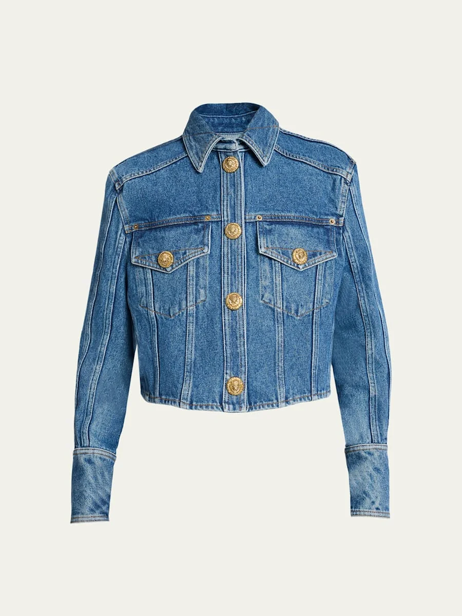 Balmain jacket is crafted of mediumwash denim featuring signature goldtone buttons Point collar; singlebreasted front Long sleeves; button cuffs Yoked back; box pleat Chest button flap pockets Relaxed fit Cropped length Cotton Professional cleaning recommended Made in Romania