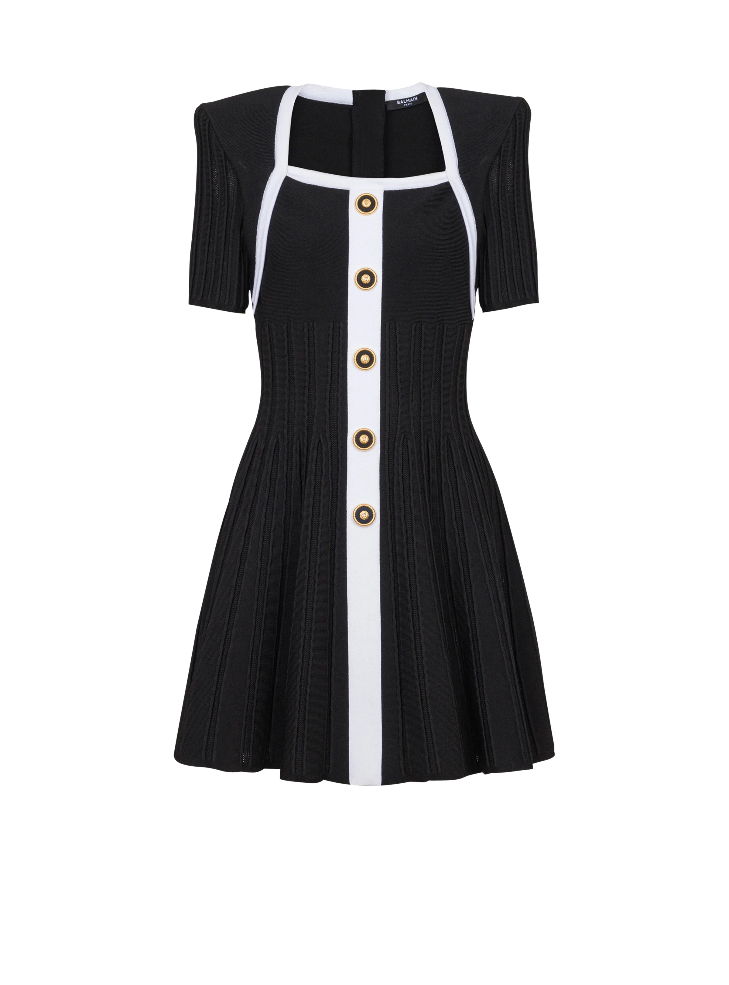 Two-tone ribbed knit dress - Square neckline - Structured shoulders - Short sleeves - 5 decorative two-tone buttons in metal - Skater skirt - Visible gold metal zip fastening on the back with Balmain Paris-engraved slider - Short cut with fitted waist and A-line skirt - Model measures 179cm and wears a size 36 - Main material: 88% viscose 12% polyester - Made in Italy - Item: EF2R7111KF13100% of the viscose fibres used to make this garment are recycled and certified