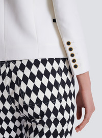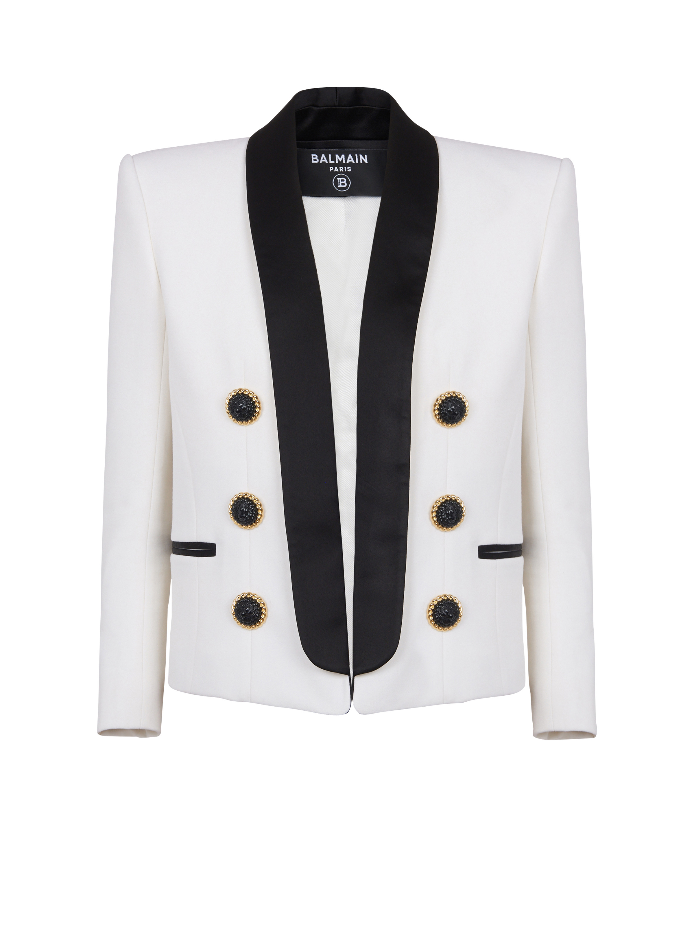 Two-tone edge-to-edge jacket with 6 buttons - Cropped fitted cut - Structured shoulders - Shawl collar with contrasting satin lapels - Long sleeves - Straight cuffs with 5 buttons - 6 decorative buttons on the front - Two-tone "Double Chain Lion" buttons in gold and black metal - 2 contrasting welt side pockets - Grain de poudre fabric - Twill lining - Model measures 178cm and wears a size 36 - Main material: 100% wool - Made in Slovakia - Item: DF1SI532ME54100% of the wool fibres used to make this garment are sourced from sheep farms that are certified and animal welfare-friendly