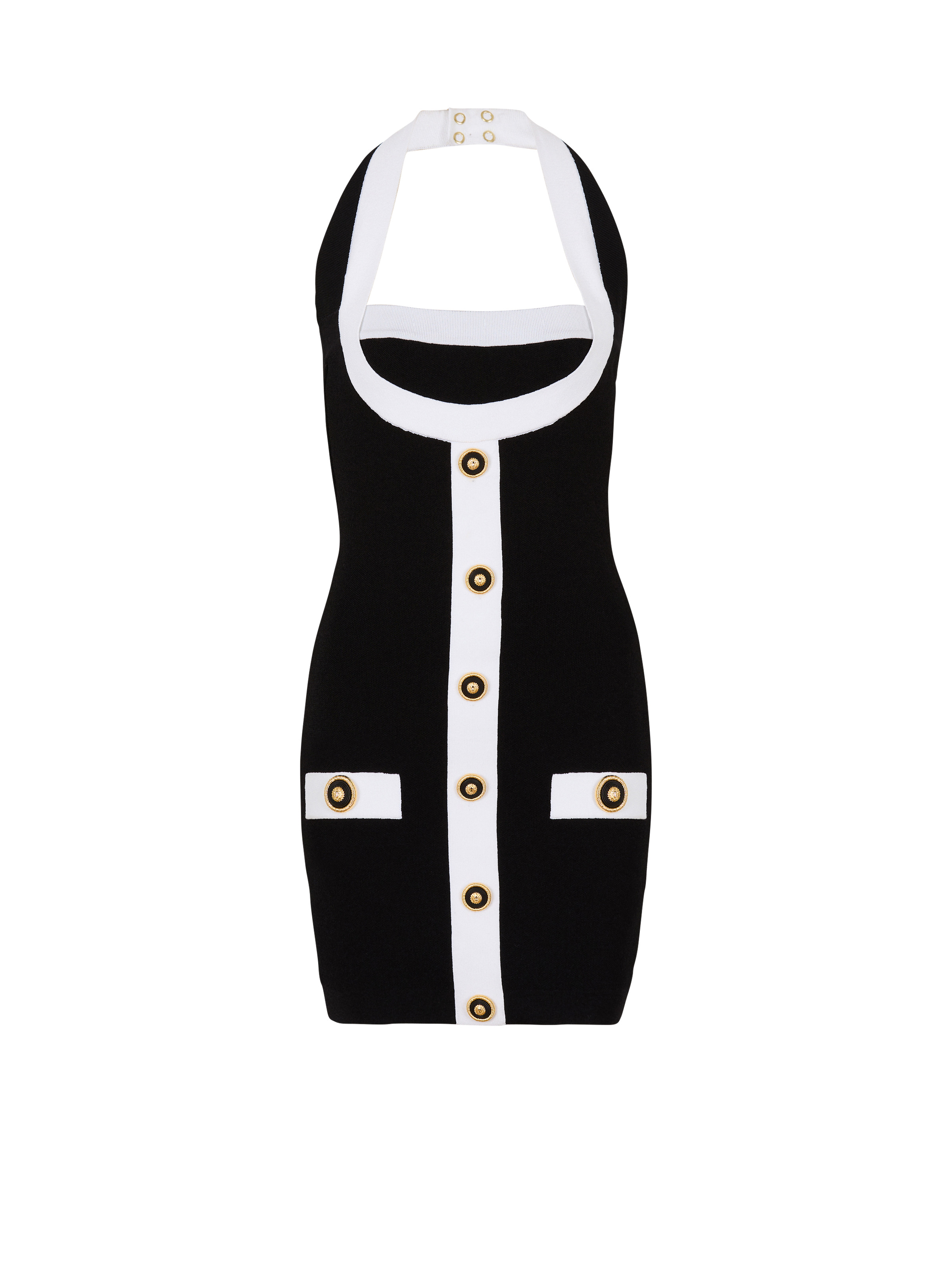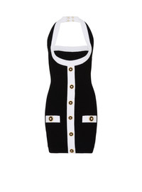 Two-tone halterneck sculpting knit dress - Square neckline - Double neckline effect - Neck fastening with 4 press studs - 8 decorative buttons on the front - "Chain Lion Thread" buttons in two-tone metal - 2 fake pockets on the front - Visible gold metal zip fastening on the back with Balmain Paris-engraved slider - Ribbed trim - Short slim fit - Model measures 179cm and wears a size 36 - Main material: 85% viscose 15% polyester - Made in France - Item: EF1R2390KH99100% of the viscose fibres used to make this garment come from certified, sustainably managed forests