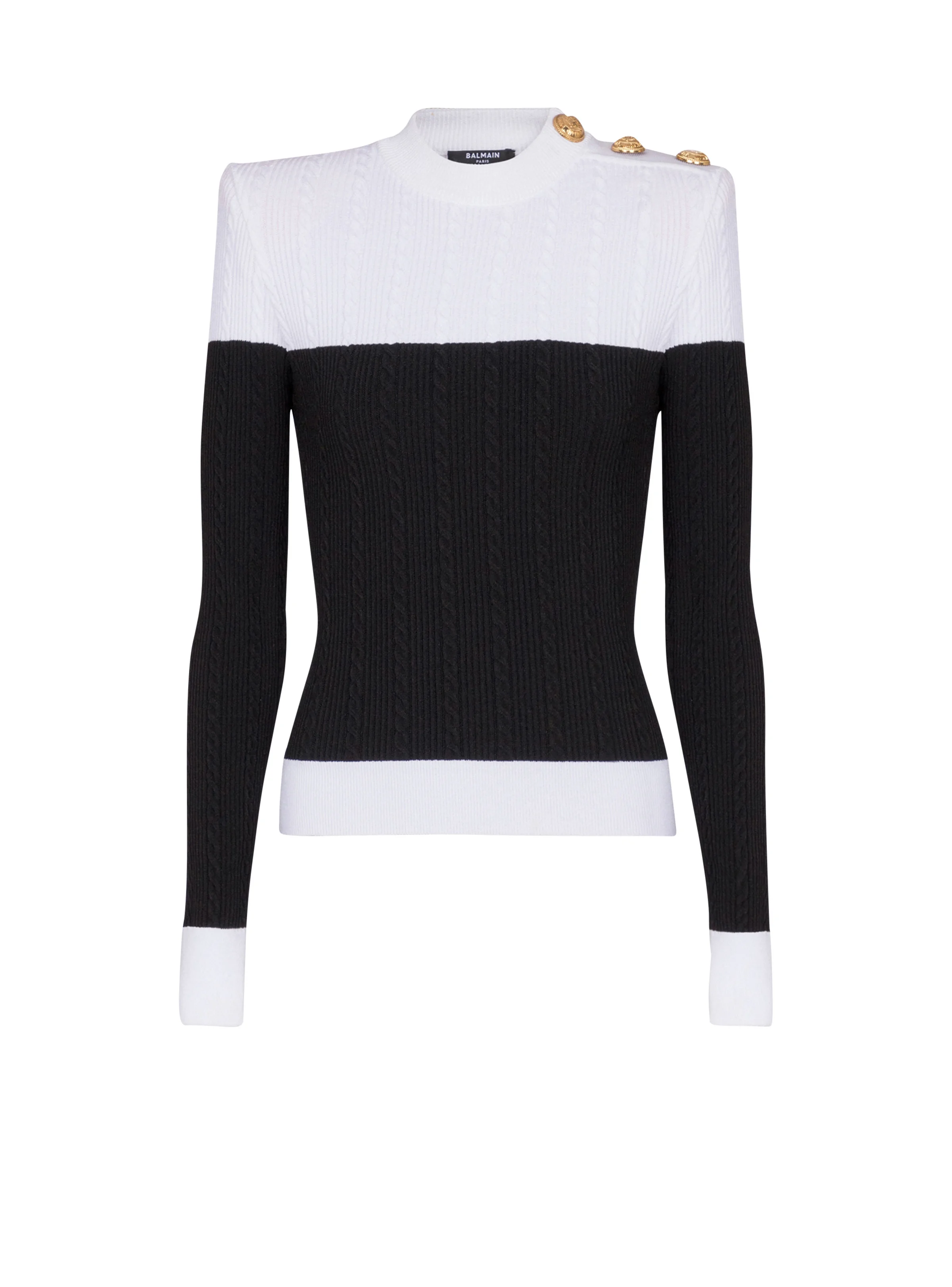 Two-tone knit top - Round neck with ribbed trim - 3 decorative "Coin" buttons in golden metal on the shoulder - Structured shoulders - Contrasting trim at the cuffs and hem - Ribbed and cable-knit fabric - Fitted cut - Model measures 179cm and wears a size 36 - Main material: 83% viscose 17% polyester - Made in France - Item: FF1KD002KI50100% of the viscose fibres used to make this garment come from certified, sustainably managed forests