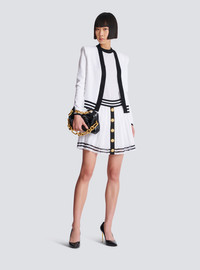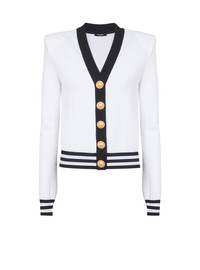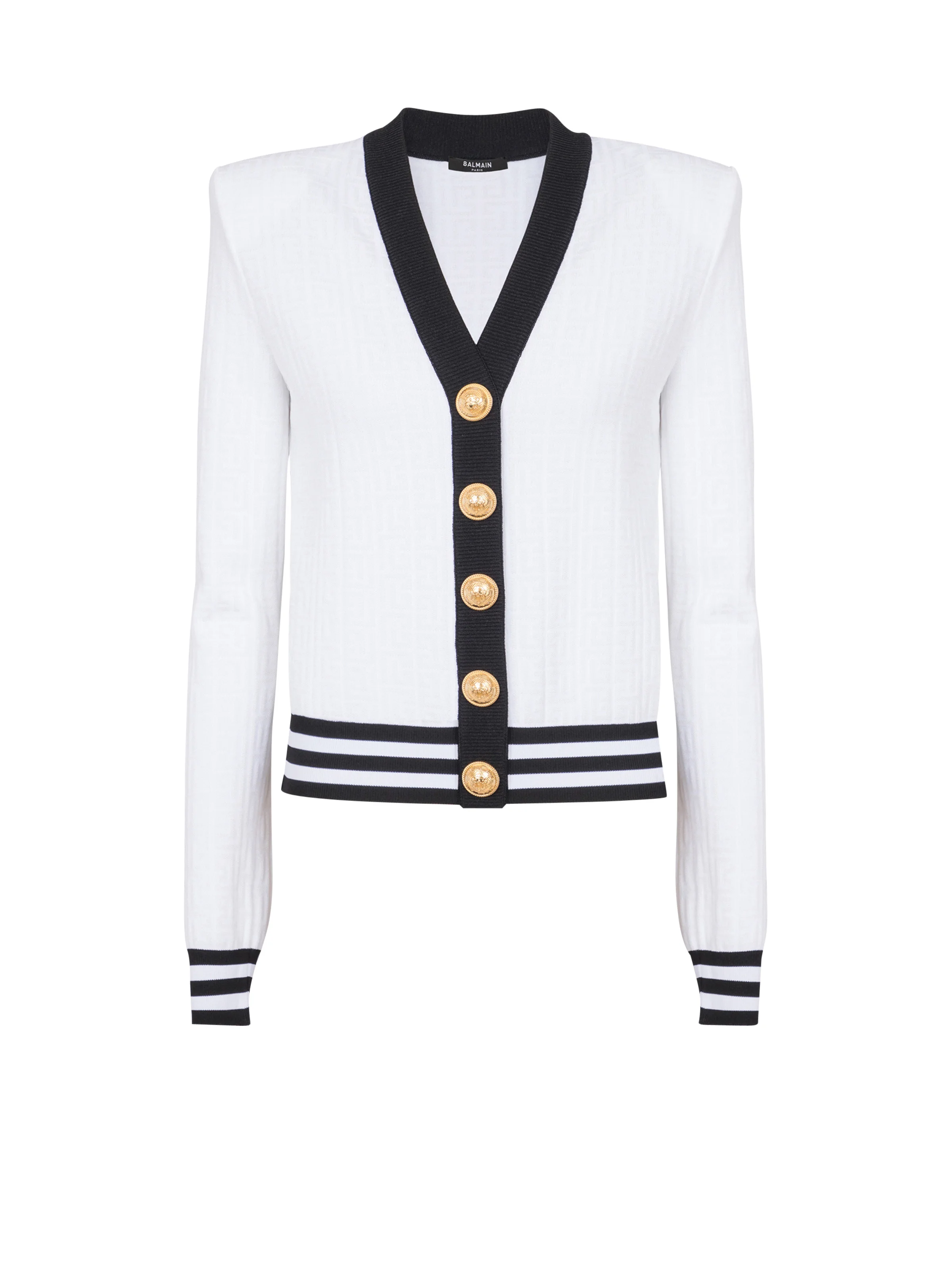 Two-tone knit cardigan with PB Labyrinthe monogram - V-neckline - Structured shoulders - Long sleeves - Front fastening with 5 golden metal "Coin" press stud buttons - Neckline with contrasting ribbed trim - Striped ribbed trim at the cuffs and hem - Cropped slim fit - Model measures 179cm and wears a size 36 - Main material: 79% viscose 13% polyamide 8% polyester - Made in France - Item: EF2KL107KI90100% of the viscose fibres used to make this garment come from certified, sustainably managed forests