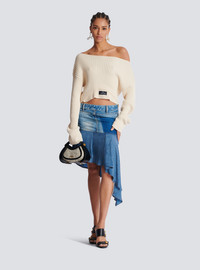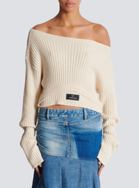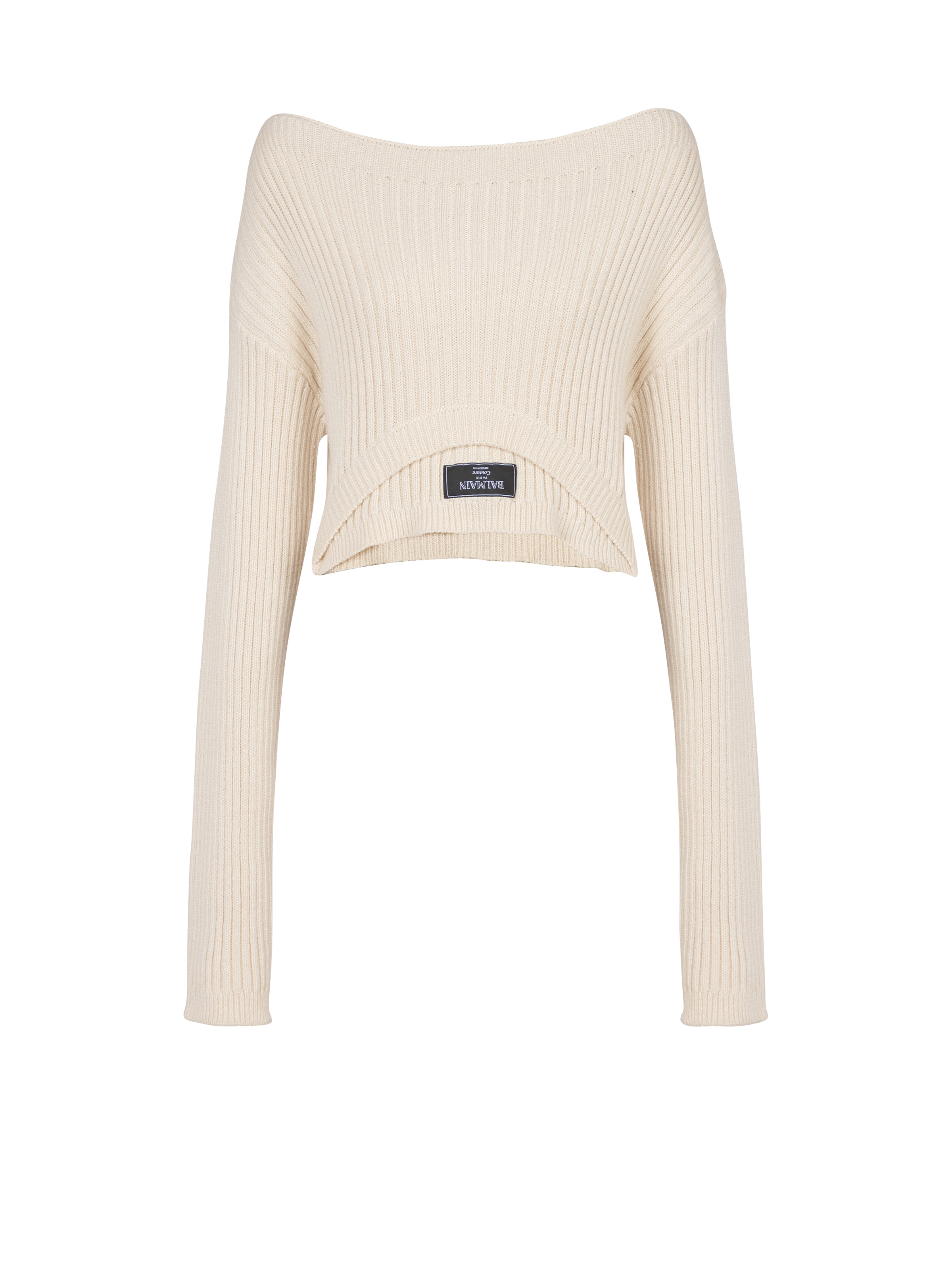 Boat neck optical illusion ribbed crop top - Boat neckline - Double neckline effect - Woven Balmain Couture label on the front - Long sleeves - Oversized fit - Model measures 179cm and wears a size 36 - Main material: 90% cotton 10% cashmere - Made in Italy - Item: EF1HU301JJ69