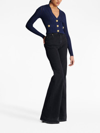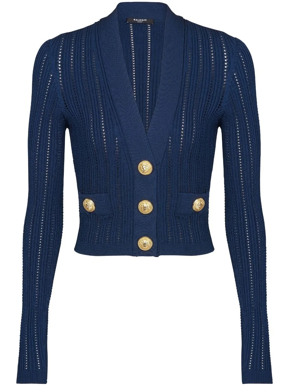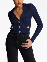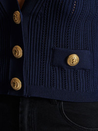 V-neck cropped cardigan Highlights - Navy blue - Knitted construction - Embossed gold-tone buttons - Slip pockets to the sides - Front button fastening - V-neck - Long sleeves - Cropped Made in Italy Composition Body: Viscose 83%, Polyamide 17% SIZE & FIT Measurement LENGTH 18.5 in(47 cm) SLEEVE LENGTH 24.8 in(63 cm)