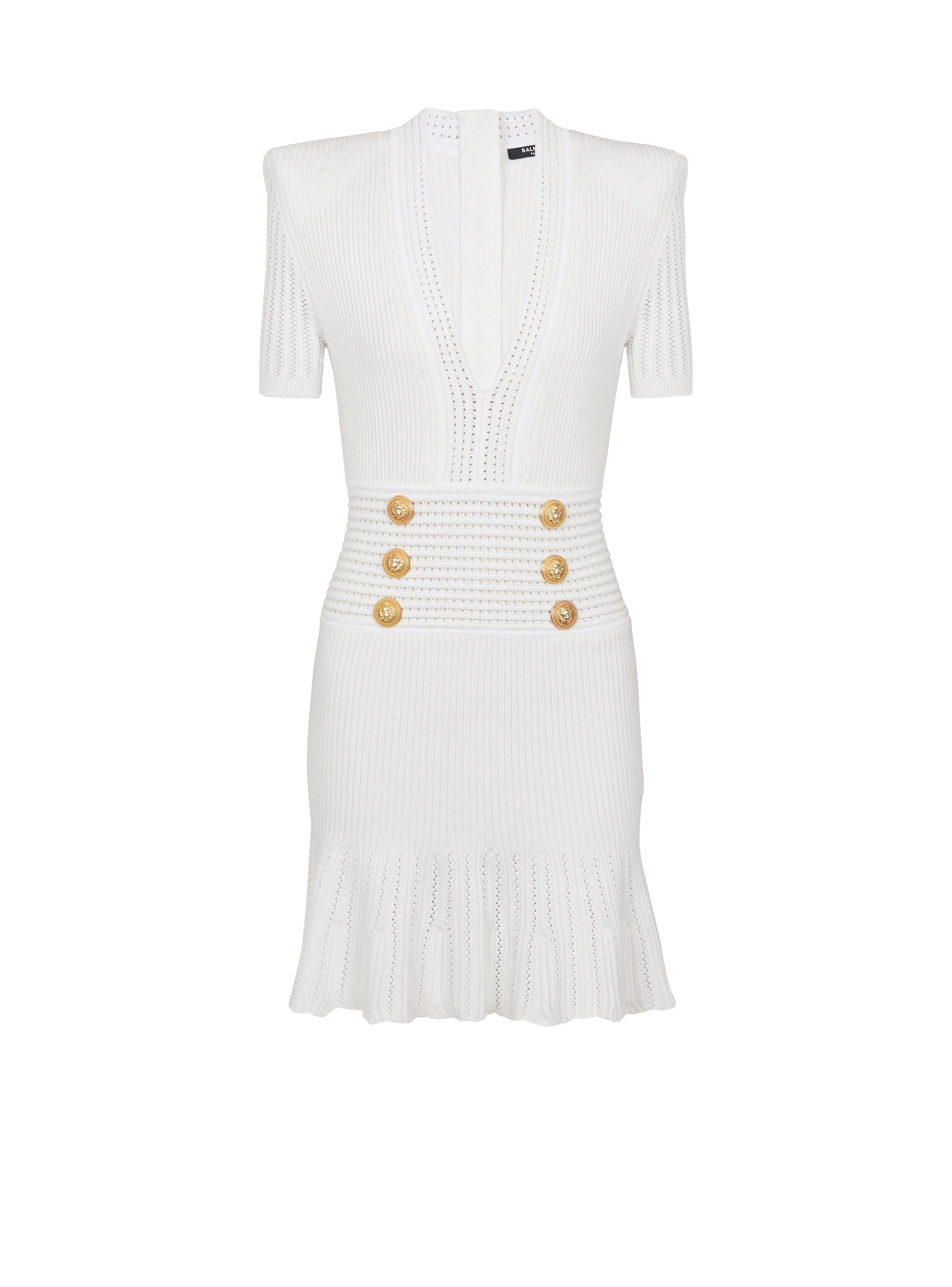 Flared knit dress - Short and flared - Plunging V-neck - Structured shoulders - Short sleeves - 6 decorative gold metal "Lion Head" buttons on the front - Visible gold metal zip fastening on the back with Balmain-engraved slider - Ribbed and openwork knit - Lacy edges - Model measures 179cm and wears a size 36 - Main material: 82% viscose 16% polyester 2% polyamide - Made in Italy - Item: DF1R7320KF24100% of the viscose fibres used to make this garment come from certified, sustainably managed forests