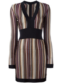 v-neck striped dress Multicolour v-neck striped dress from Balmain featuring vertical stripes, a fitted waist, a bodycon style, long sleeves and a v-neck. Made in France Composition Viscose 60%, Cupro 26%, Polyester 14% SIZE & FIT Model measurements Height 5 ft 10 in(1.78 m) Bust/Chest 31.49 in(80 cm) Hips 37 in(94 cm) Waist 23.62 in(60 cm) Washing instructions Dry Clean Only
