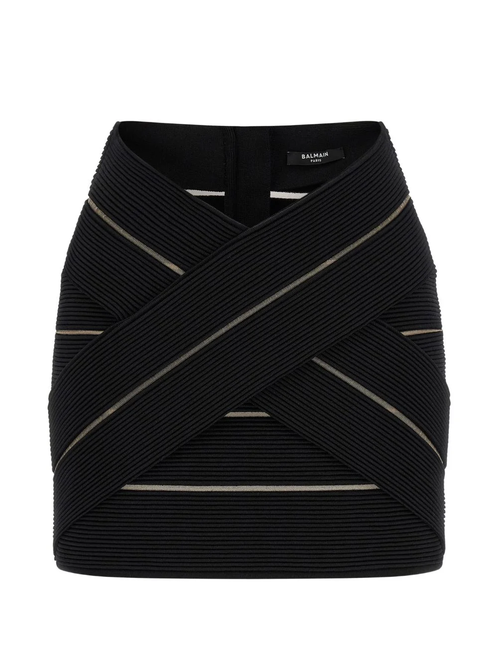 V-waist zip-fastening mini skirt Highlights - Black - V-waist - Cross front - Back zip fastening - Ribbed texture Made in Italy Composition Viscose 77%, Polyester 14%, Polyamide 8%, Spandex/Elastane 1% Washing instructions Read Manufacturer Guidelines