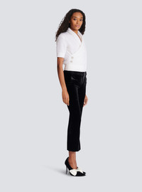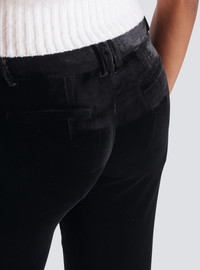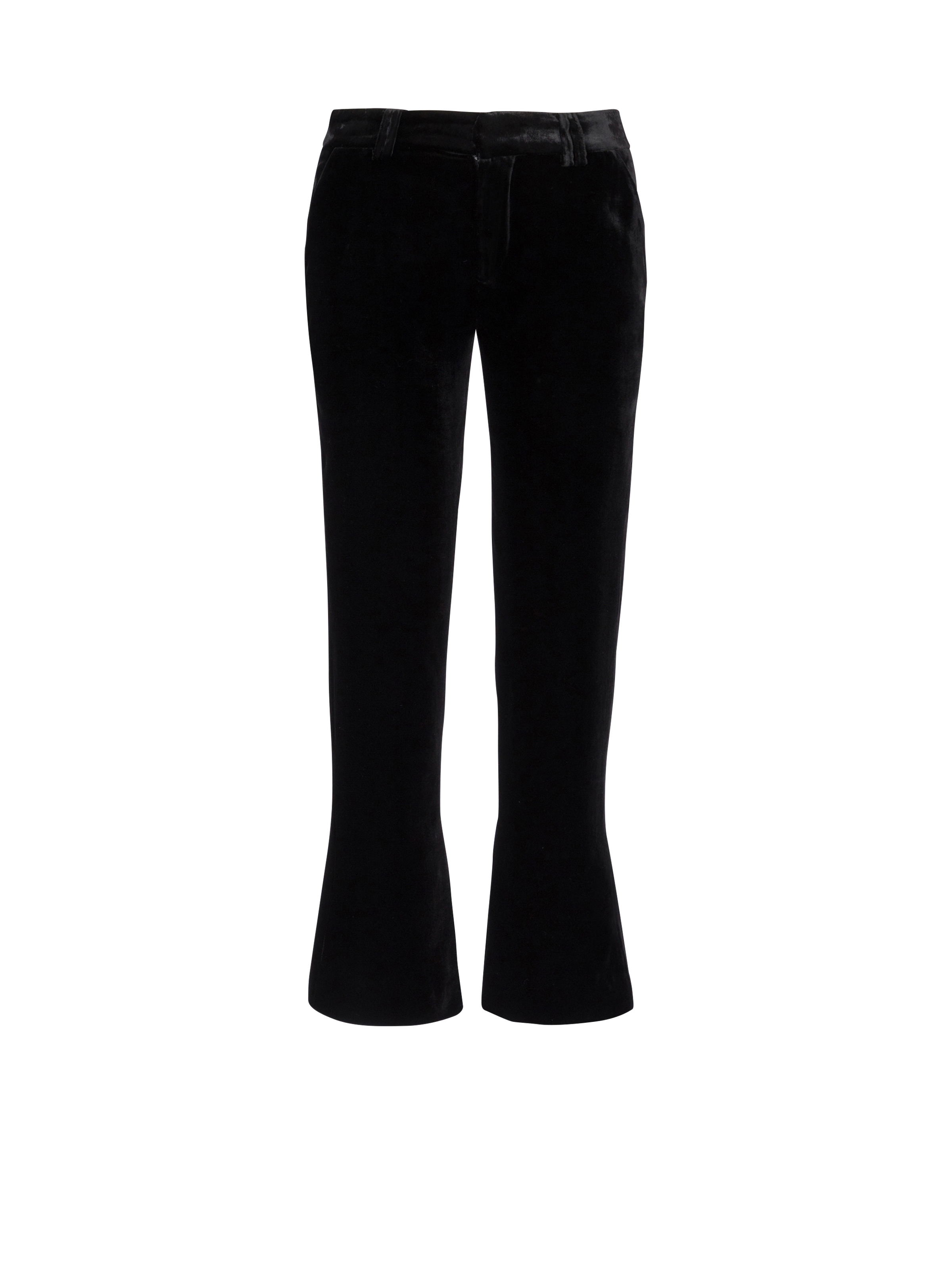 Velvet trousers - Flared cut - 2 slanted pockets, 2 back pockets - Nylon zip and invisible hook fastening - Double and triple belt loops - Model measures 175cm and wears a size 36 - Material: 82% viscose, 18% silk - Made in Slovakia - Item: BF0PP127VB44